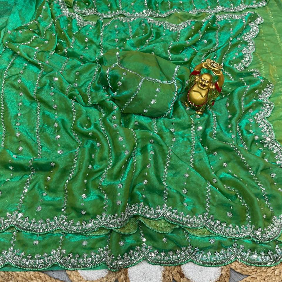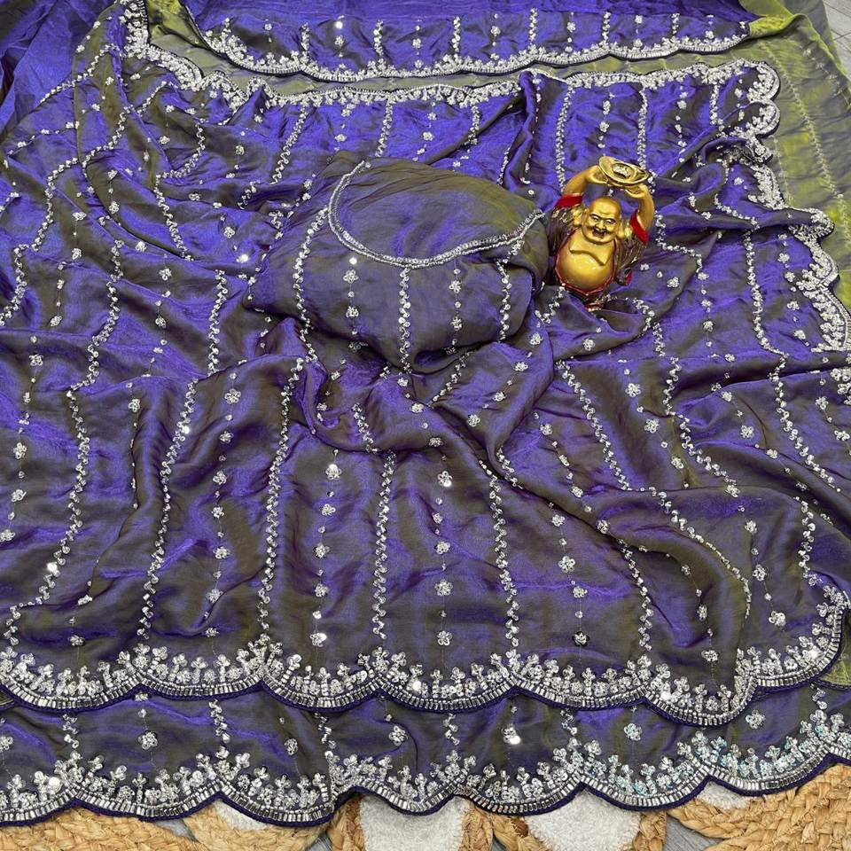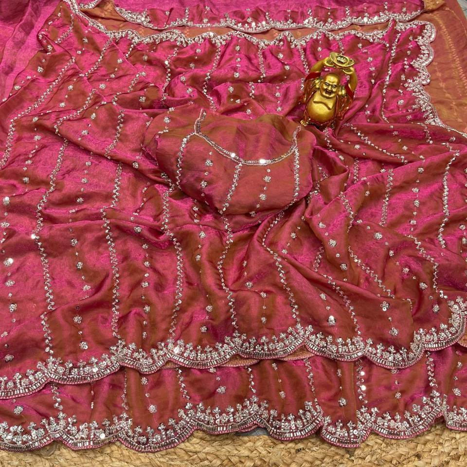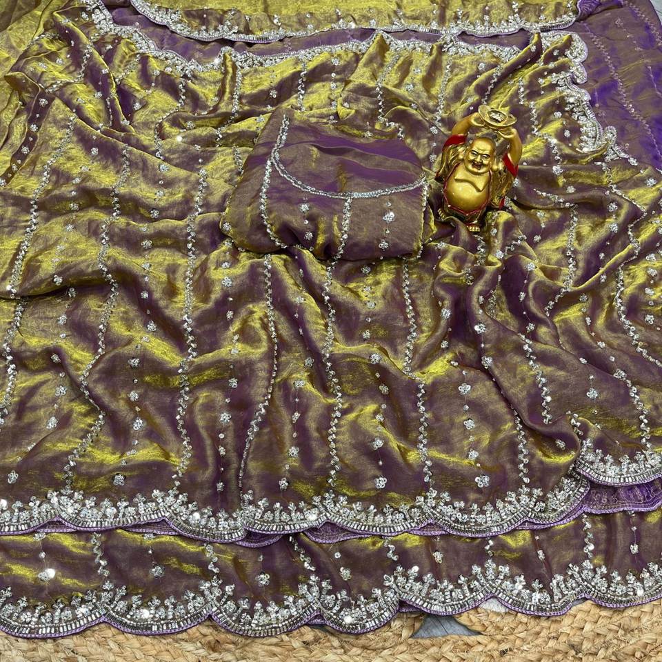 Sari de soirée exquis en velours brillant et soie pure, orné de perles dorées et de broderies artisanales