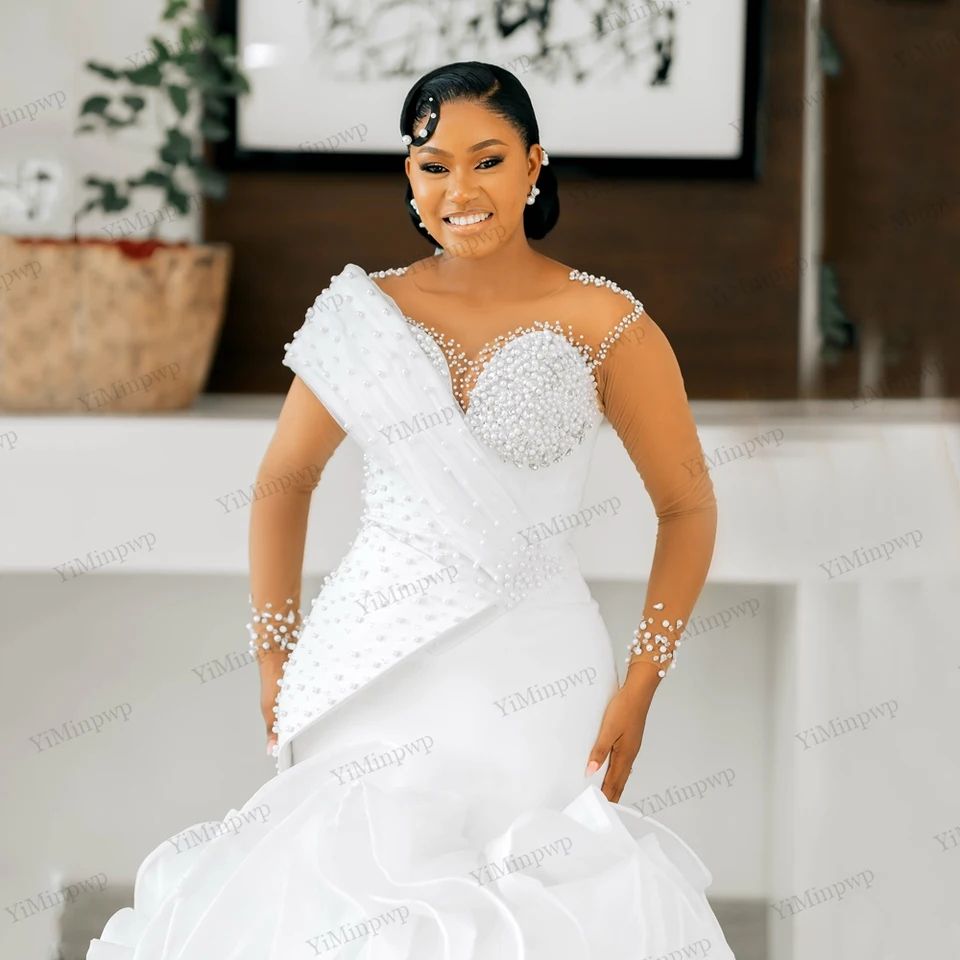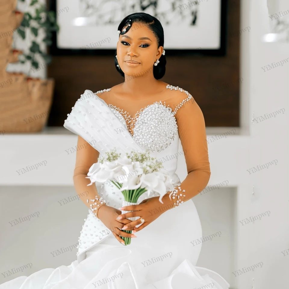 Robes de mariée sirène longues et exquises pour filles noires, perles, manches illusion, robes de mariée formelles, robes personnalisées pour femmes
