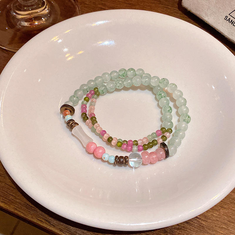Bracelet rétro multi-rangs exquis inspiré de la nature forestière avec des accents de rubis et des perles de jade glacé originales