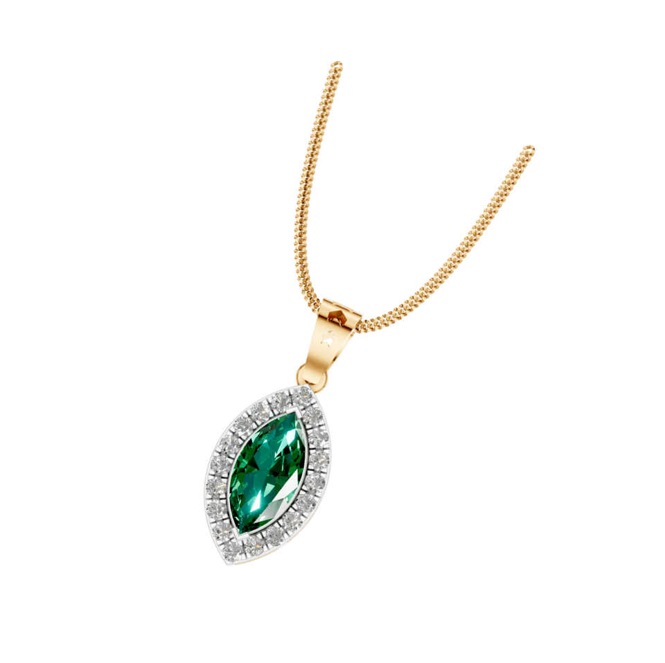 Exquisite Precious Emerald Marquise-Cut Gemstone Gold or Yellow Gold Pendant with a Sparkling Diamond Halo for Timeless Elegance