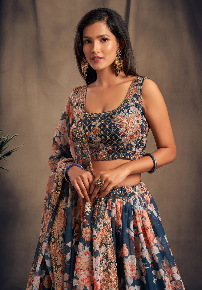 Ensemble de fil imprimé et de broderie exquis Lehenga Choli pour les fêtes de mariage et les cérémonies culturelles d'Inde