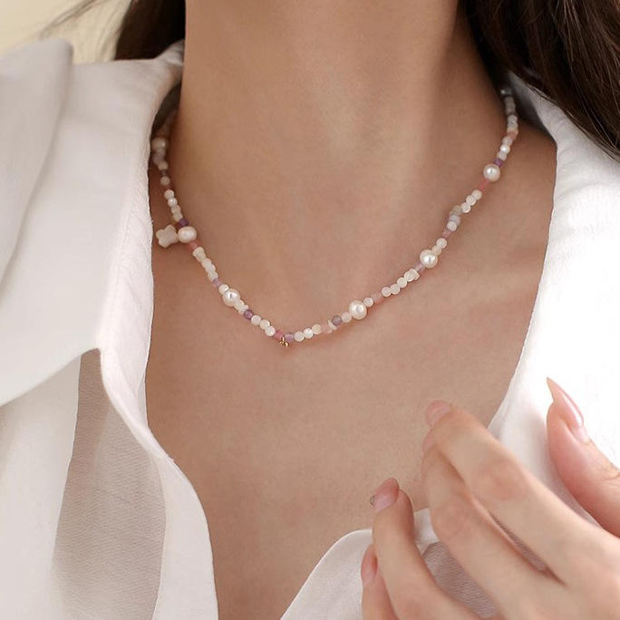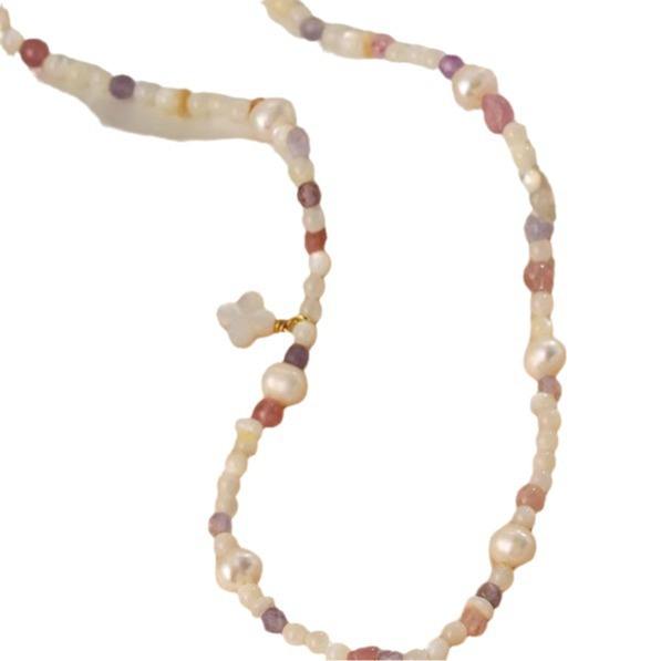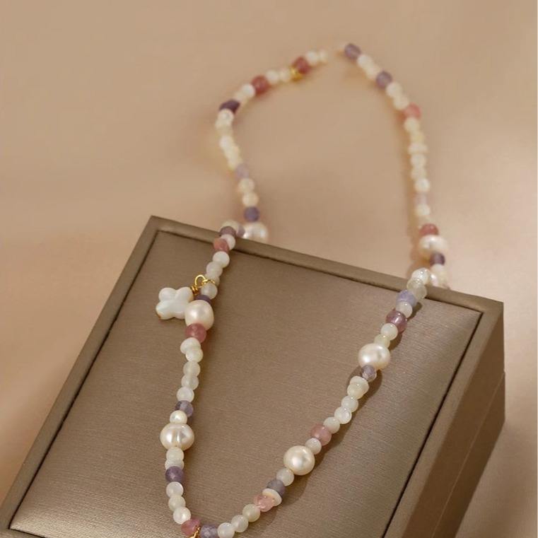Collier pendentif coquillage exquis, perle d'eau douce naturelle, perle de cristal fraise, dopamine, collier de perles tendance rafraîchissant