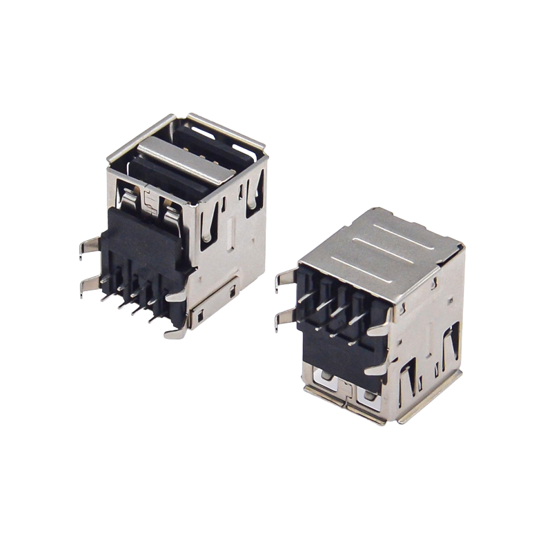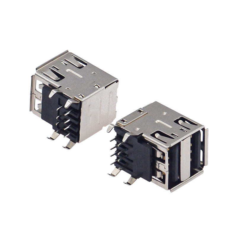 Connecteur USB-A femelle à angle droit, hauteur étendue 17,5 mm, type à sertir double couche avec broches coudées, noir, pour USB 2.0