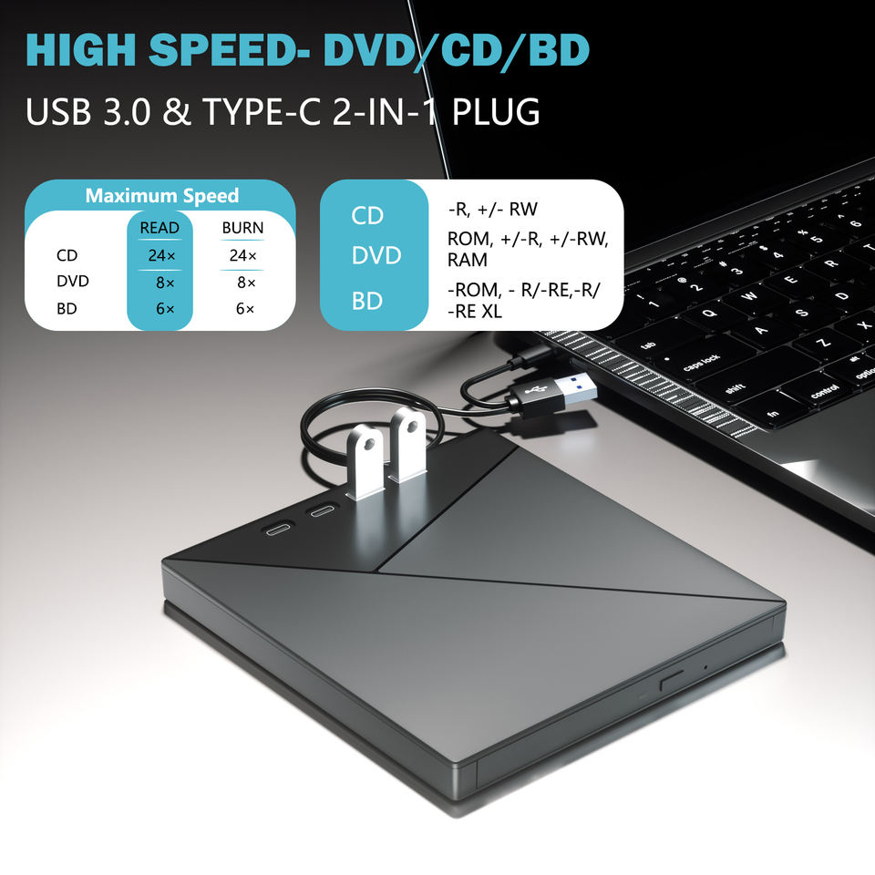 Lecteurs Blu-Ray externes, graveur Blu Ray portable 4K USB 3.0 Type-C UHD Lecteur BD avec port SD/TF