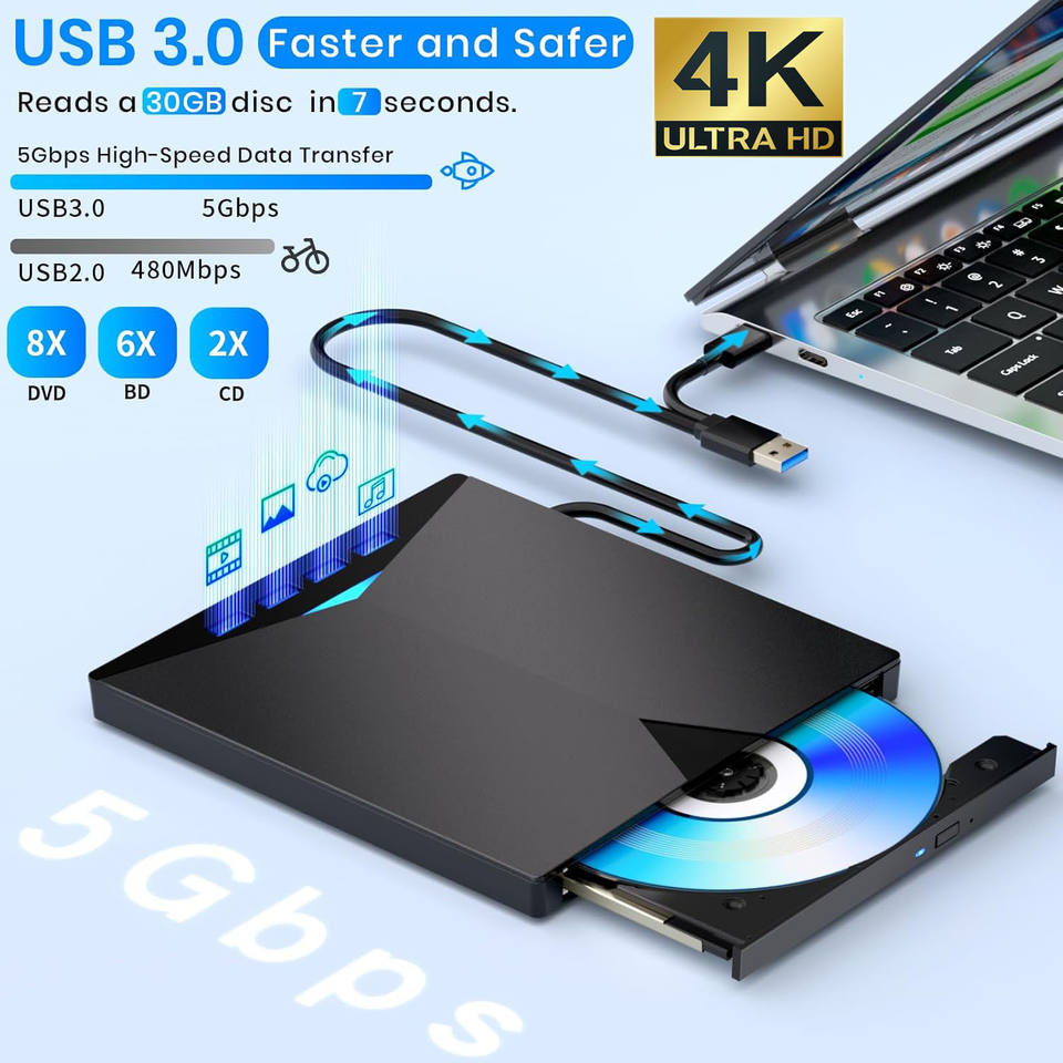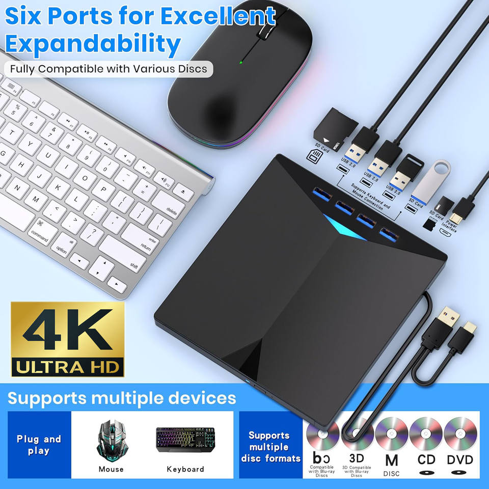 Lecteurs Blu-ray externes 4K, graveur Blu-ray portable USB 3.0 Type-C, lecteur UHD BD avec port SD/TF, graveur CD/DVD R/W, lecteur Blu-ray 3D