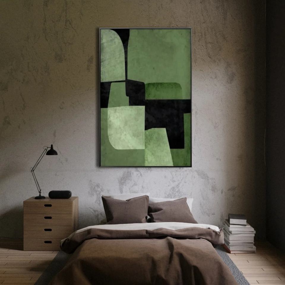 Toile d'art abstrait extra large originale, paysage vert sarcelle beige noir, peinture à l'huile, dessin à la main par l'artiste, encadrée, faite à la main