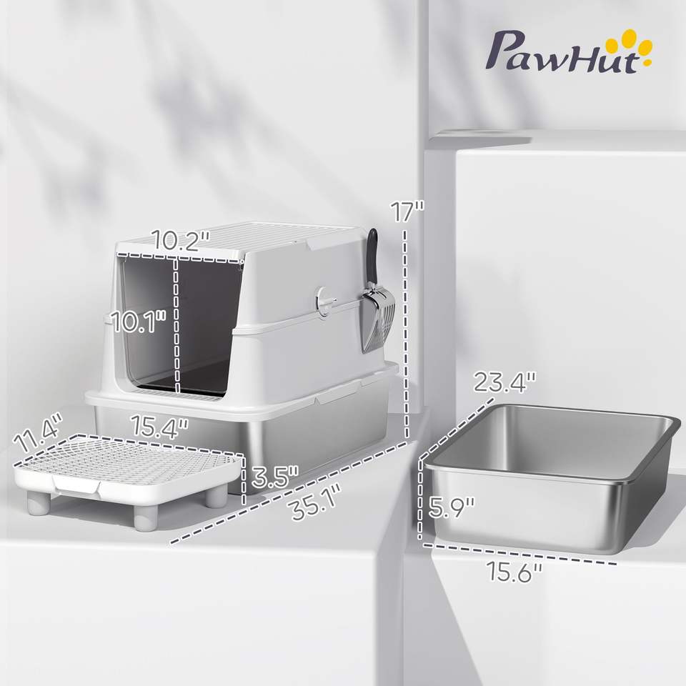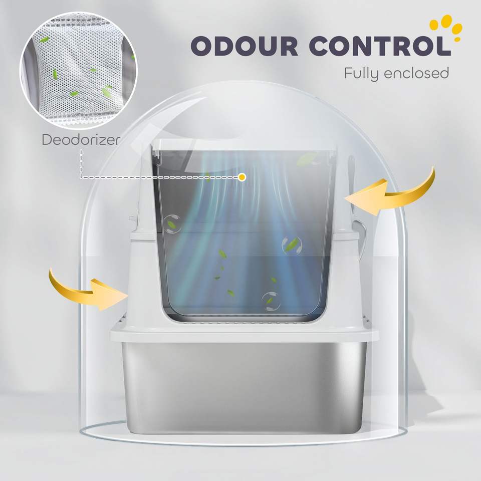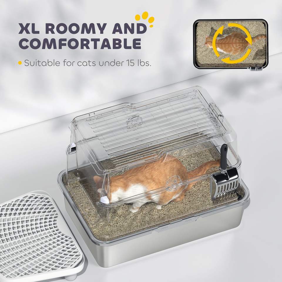 Bac à litière pour chat en acier inoxydable extra large avec couvercle rabattable, enclos à côtés hauts, pelle incluse - pour les grands chats et leurs besoins