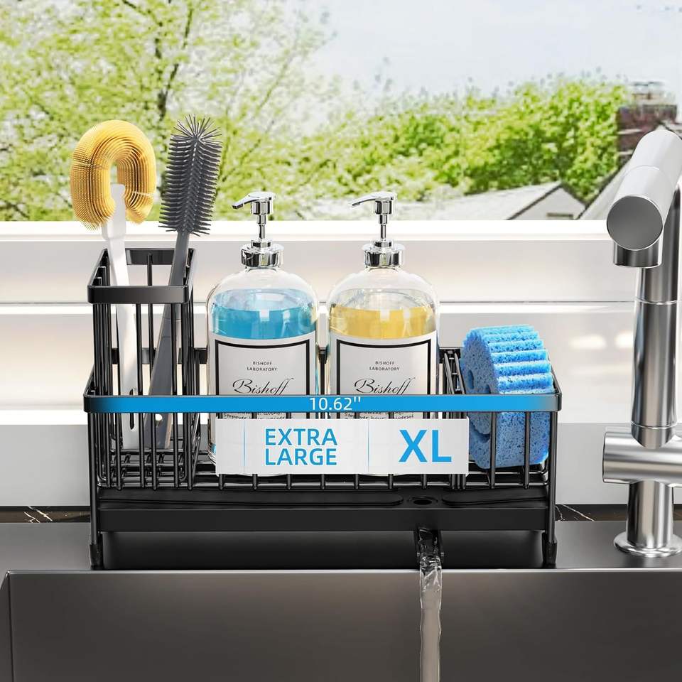 Organisateur d'évier de cuisine extra large en acier inoxydable avec support pour brosse à vaisselle et égouttoir pour rangement d'ustensiles