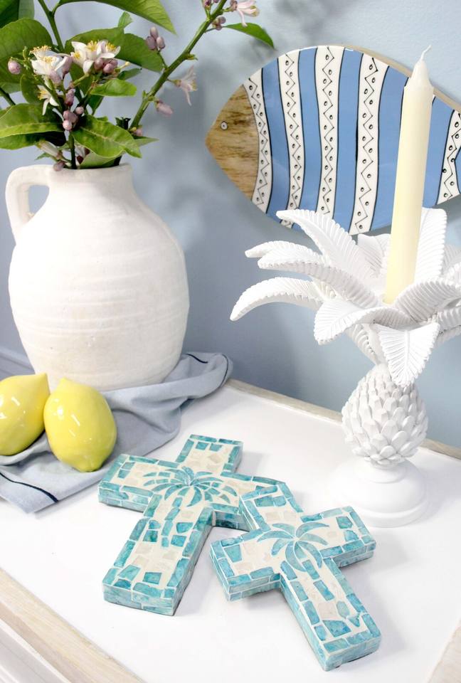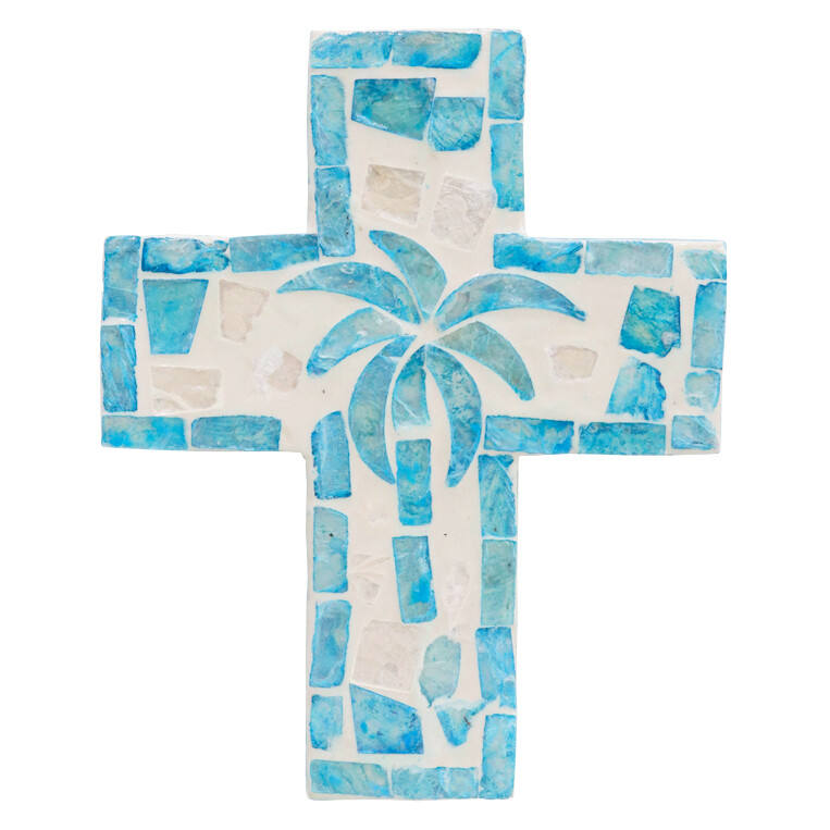 Décoration murale en mosaïque artisanale extraordinaire, croix en MOP bleu, art mural palmier, accent côtier, décoration tropicale suspendue pour la maison