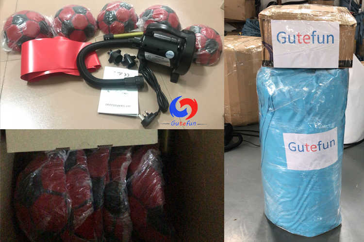 Le jeu de fléchettes de golf gonflable sont emballés dans un nouveau tapis à l'intérieur et un sac de PVC solide à l'extérieur, les souffleurs d'air électriques avec des kits de réparation emballés dans une boîte en carton.