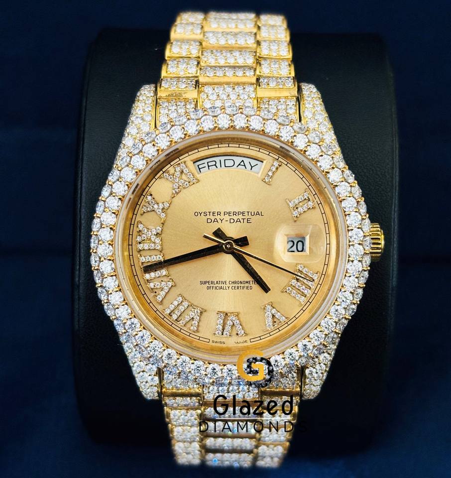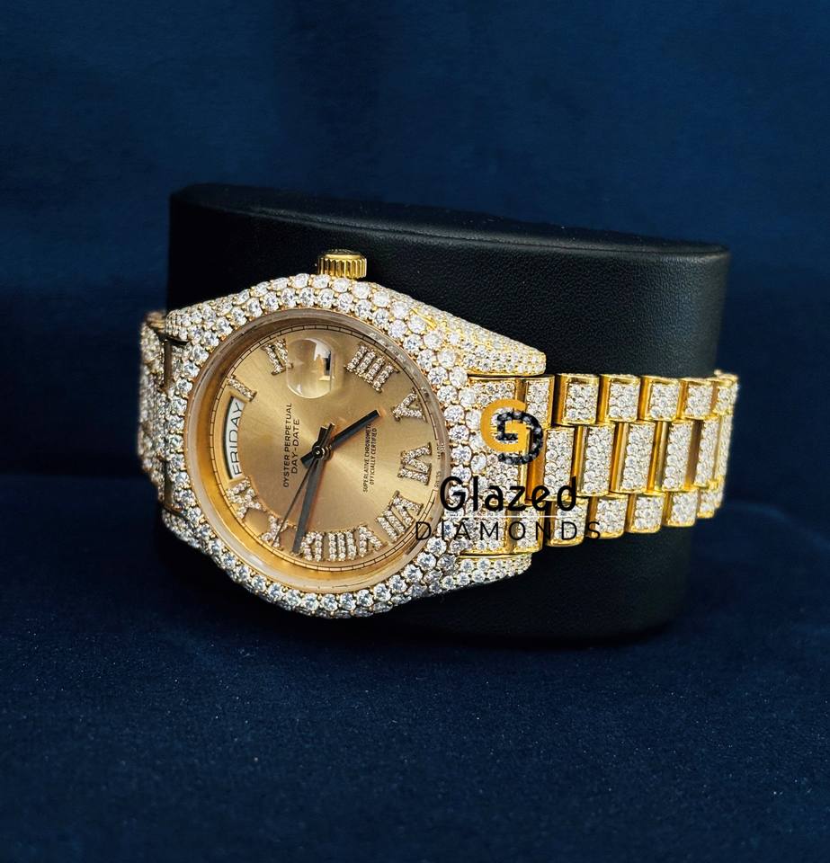 Montre pour homme avec fermoir à bouton poussoir design attrayant, diamant de laboratoire véritable taille brillant rond et chiffres romains sertis.