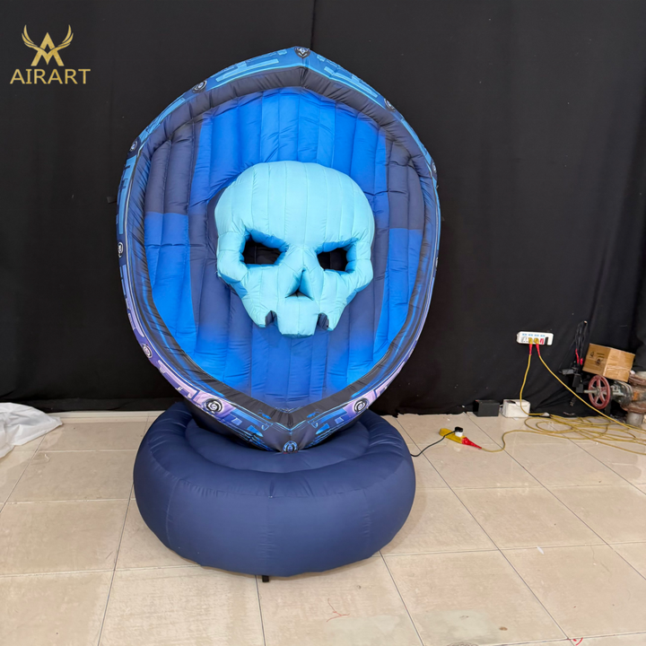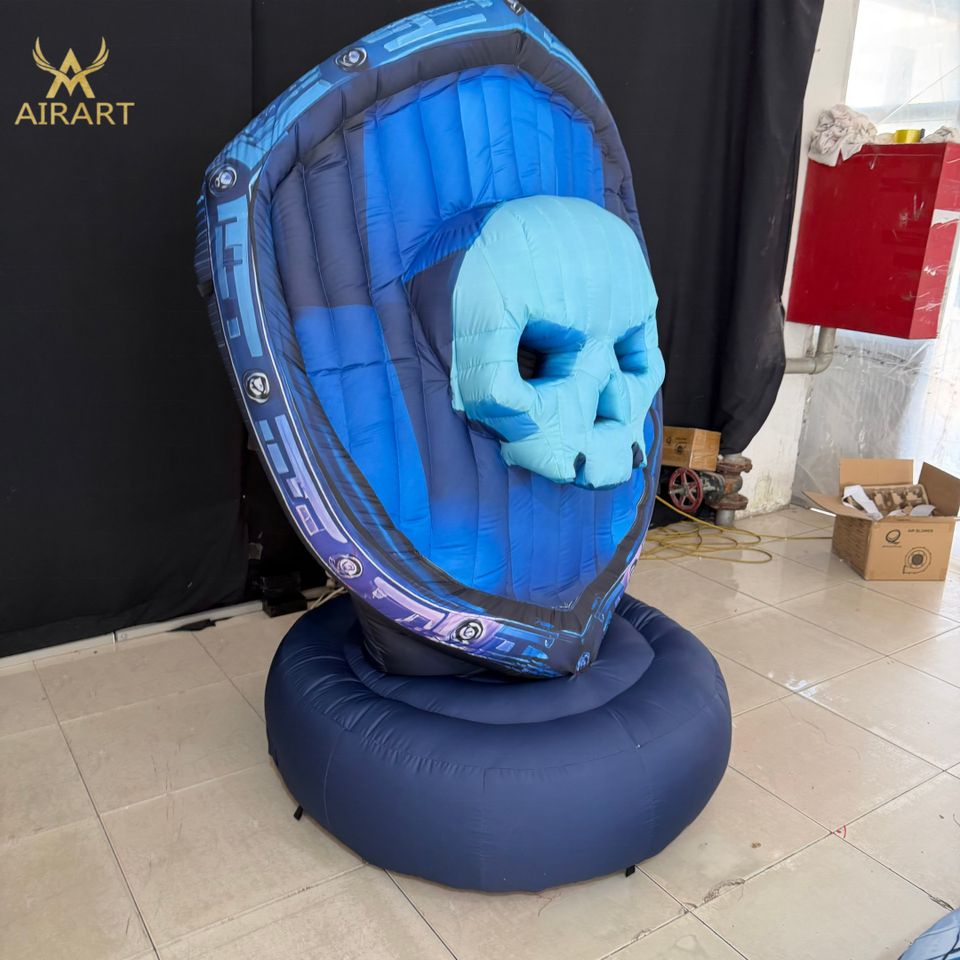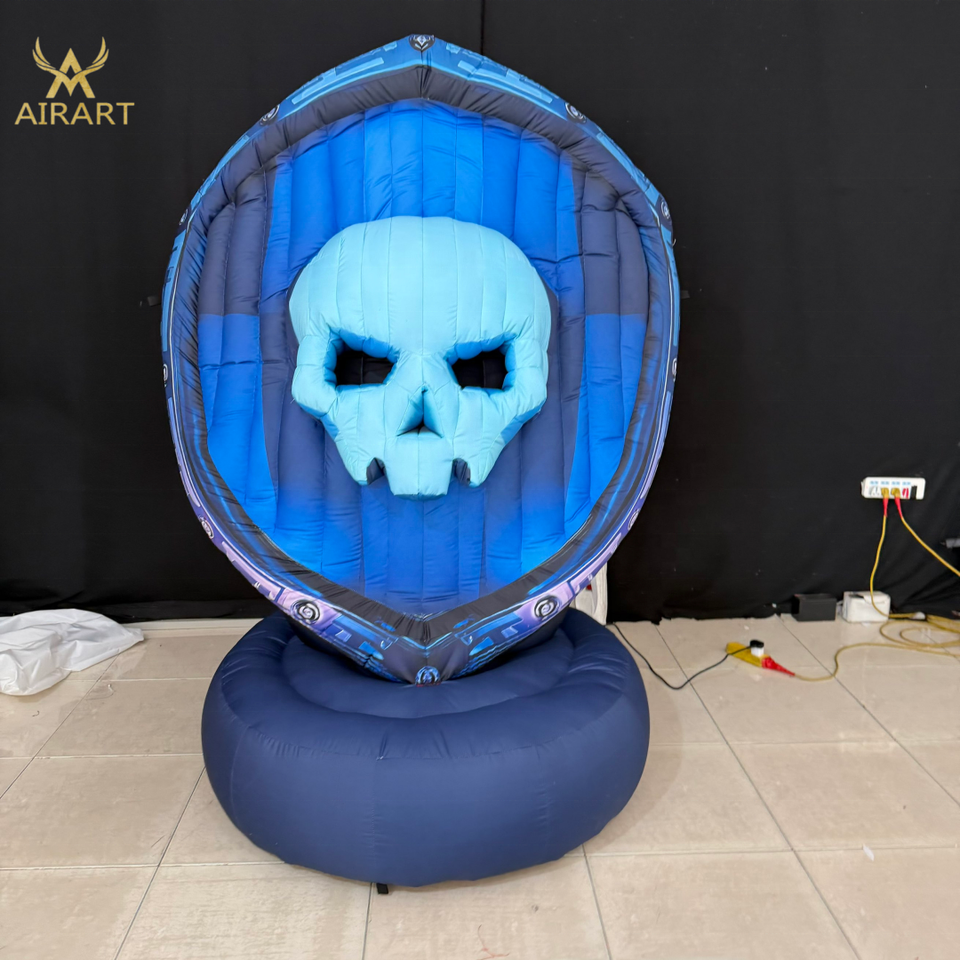 Installations artistiques gonflables attrayantes en forme de bouclier de crâne et de bouteille de boisson, grands accessoires gonflables pour la location dans les centres commerciaux et les événements en plein air
