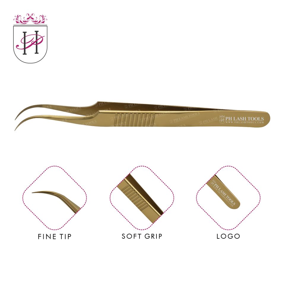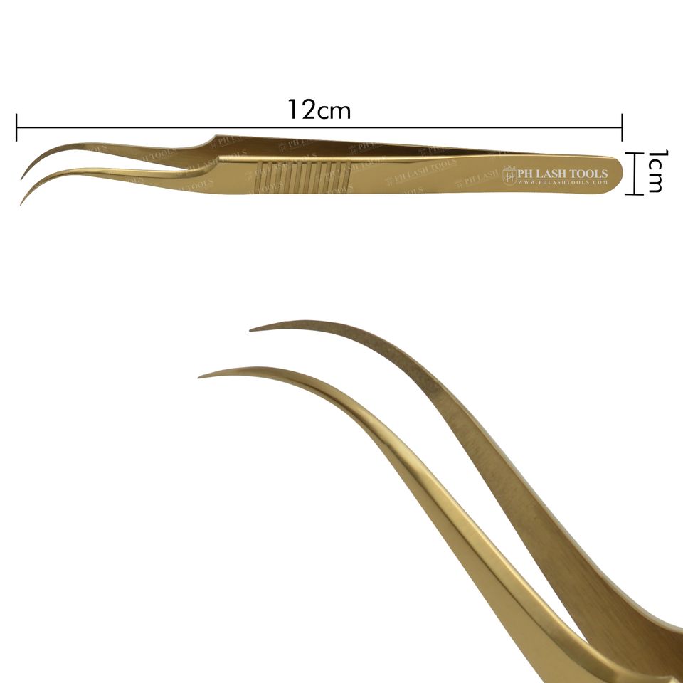 Pince à épiler courbée en acier inoxydable, pour extensions de cils, de couleur or, Design privé, avec prise à main