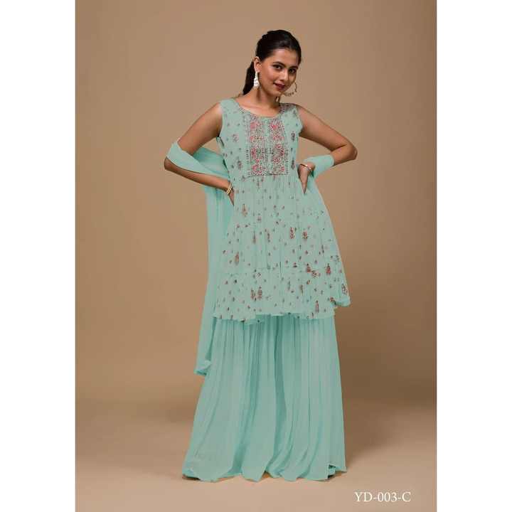 FABULEUX GEORGETTE BRODERIE SÉQUENCE TRAVAIL TOP PALAZZO AVEC DUPATTA VERT MER