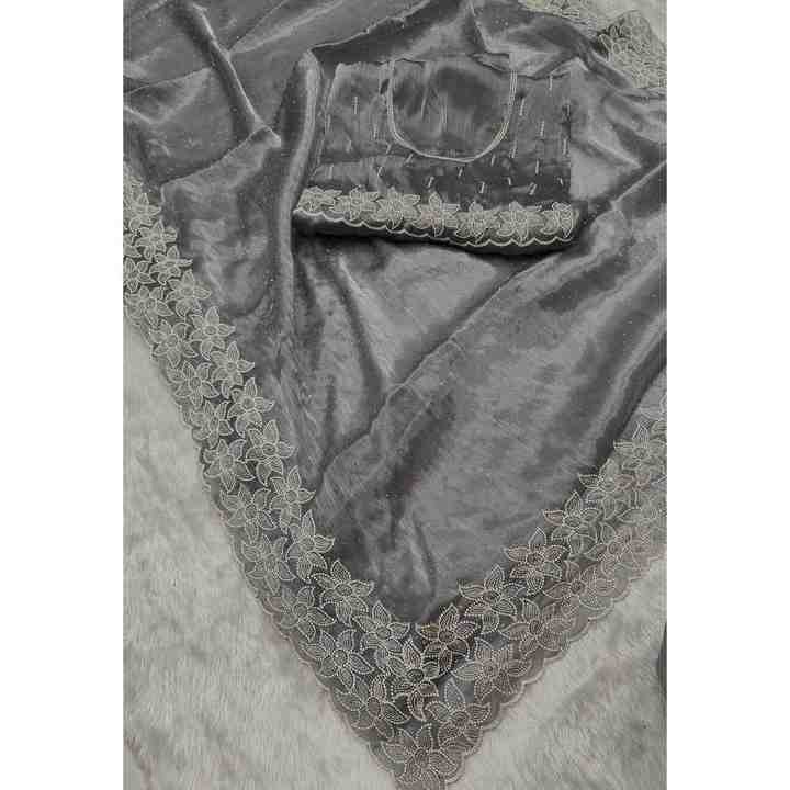 FANCY BARBARI SILK MULTI THREAD STONE WORK SAREE WITH UNSTITCHED BLOUSE GREY