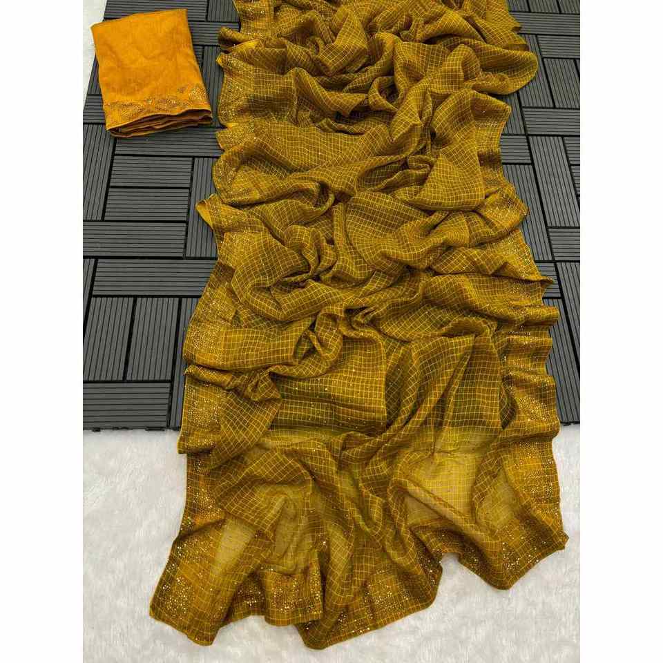 FANCY CHIFFON SIROSKI WORK SAREE WITH UNSTICTHED BLOUSE MUSTARD