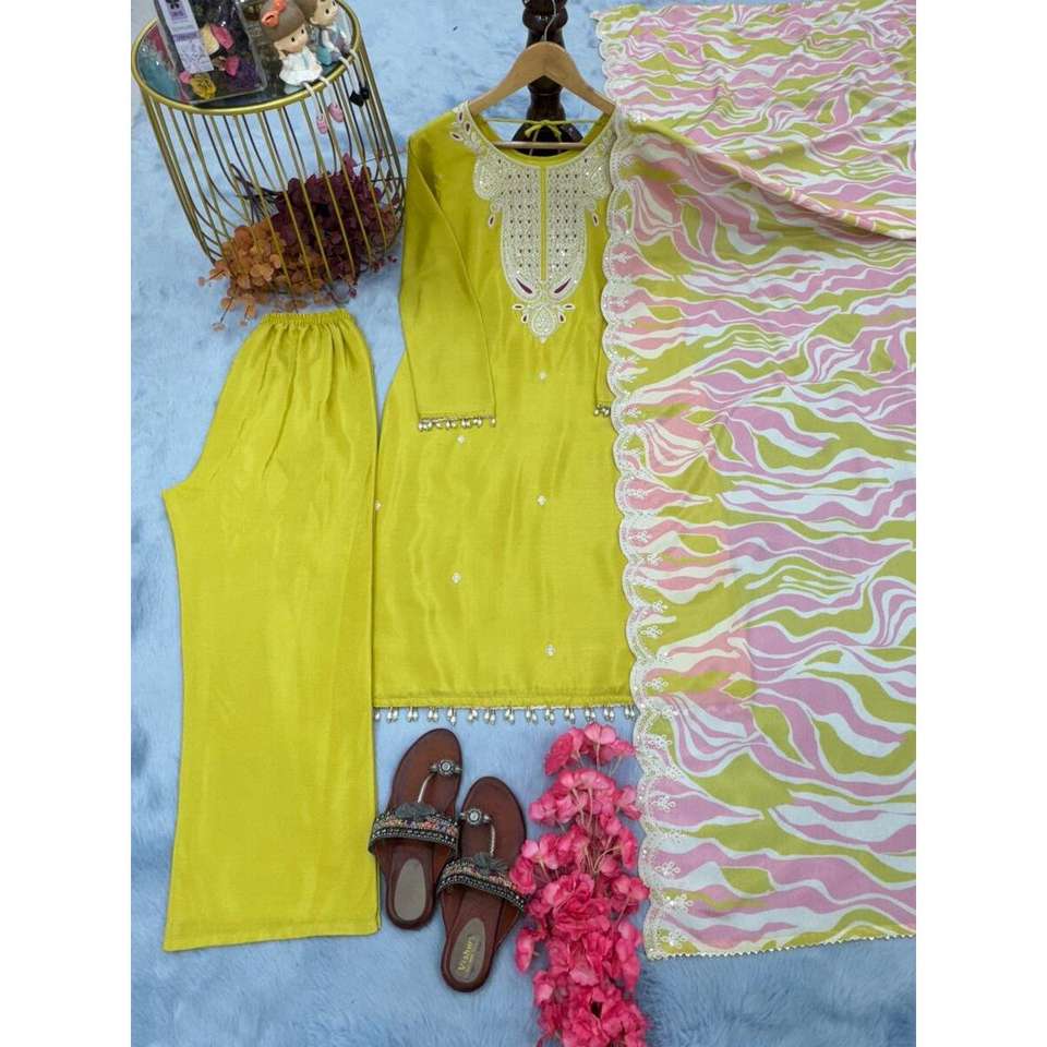 FANCY CHINON SILK EMBROIDERY CODING WORK TOP PALAZZO WITH DUPATTA YELLOW