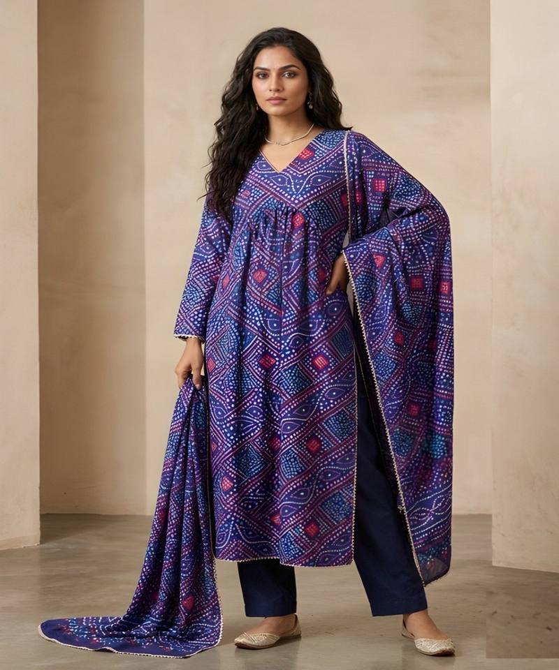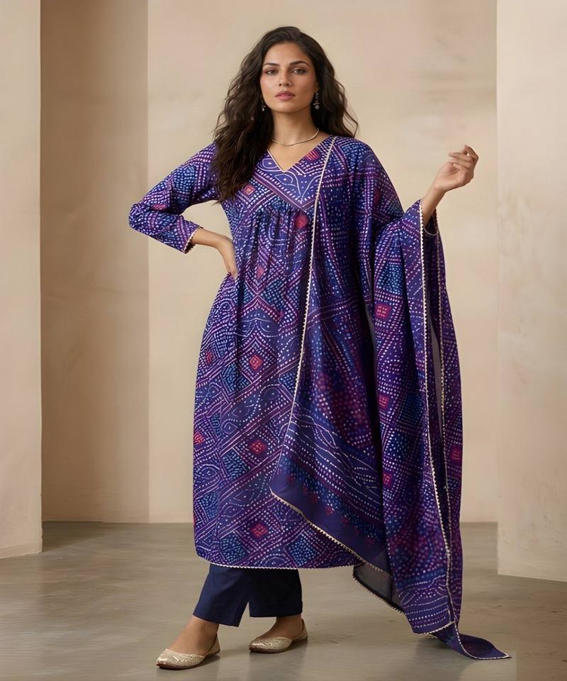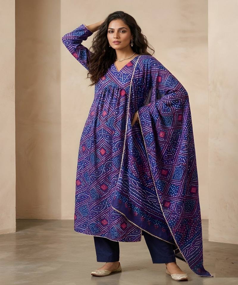 Ensemble haut-bas DELTA BANDHANI imprimé avec dupatta, tenue de fête, prix de gros, vêtement ethnique, coton violet de luxe, séchage rapide
