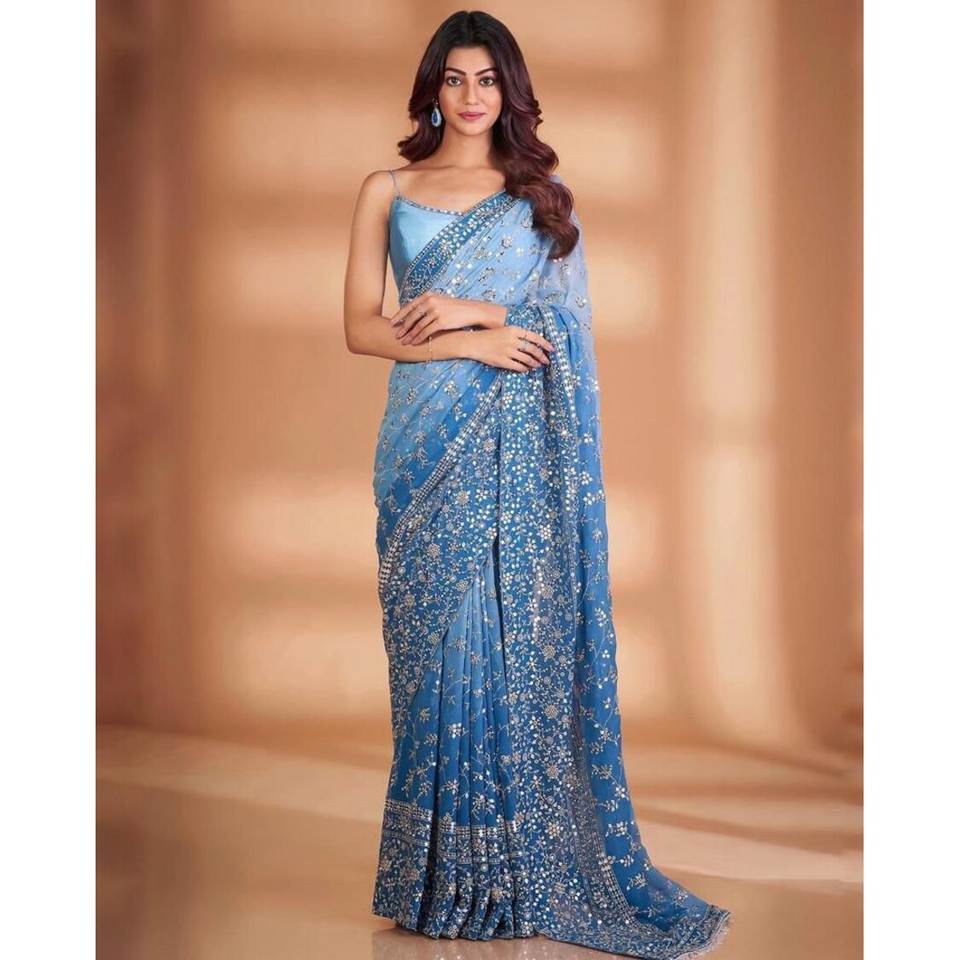 FANCY GEORGETTE EMBROIDERY SEQUENCE THREAD WORK SAREE WITH UNSTITCHED BLOUSE SKY