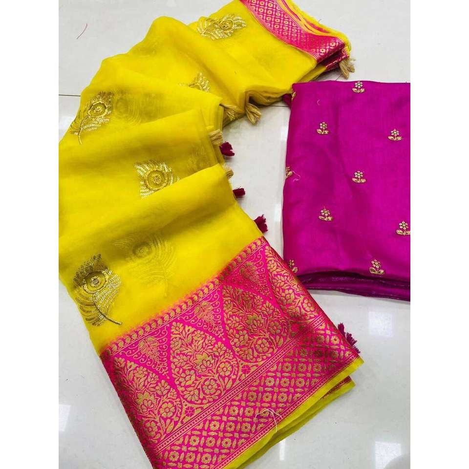 FANCY ORGANZA JARI SEQUENCE JACQUARD BORDER WORK SAREE with UNSTITCHED BLOUSE YELLOW