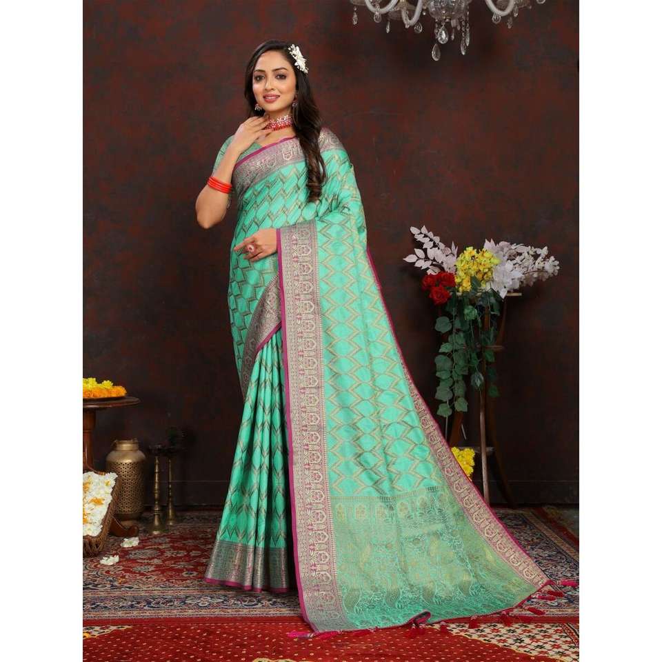 À LA MODE SOIE DOUCE JARI TISSANT TRAVAIL SAREE AVEC CHEMISIER NON COUDU MENTHE