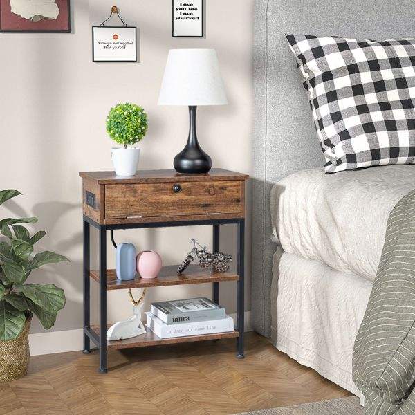 FCH 1.5M Long Power Cord USB Socket Antique Wood Grain Color 2-Layer Frame Bedside Cabinet Triamine Black Iron Bedroom Furniture