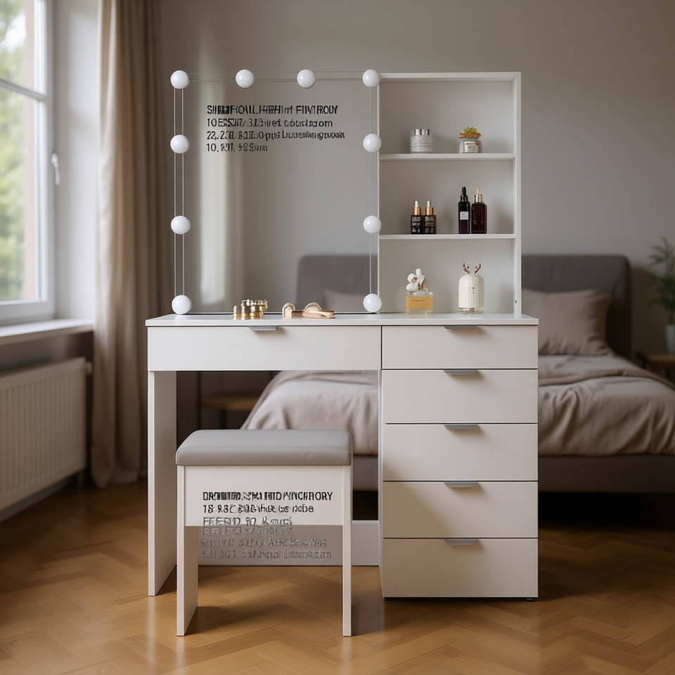 FCH White Makeup Vanity Set With Mirror Cabinet 6 Drawers 2 Shelves Lighted Mirror Modern Design Bedroom Furniture