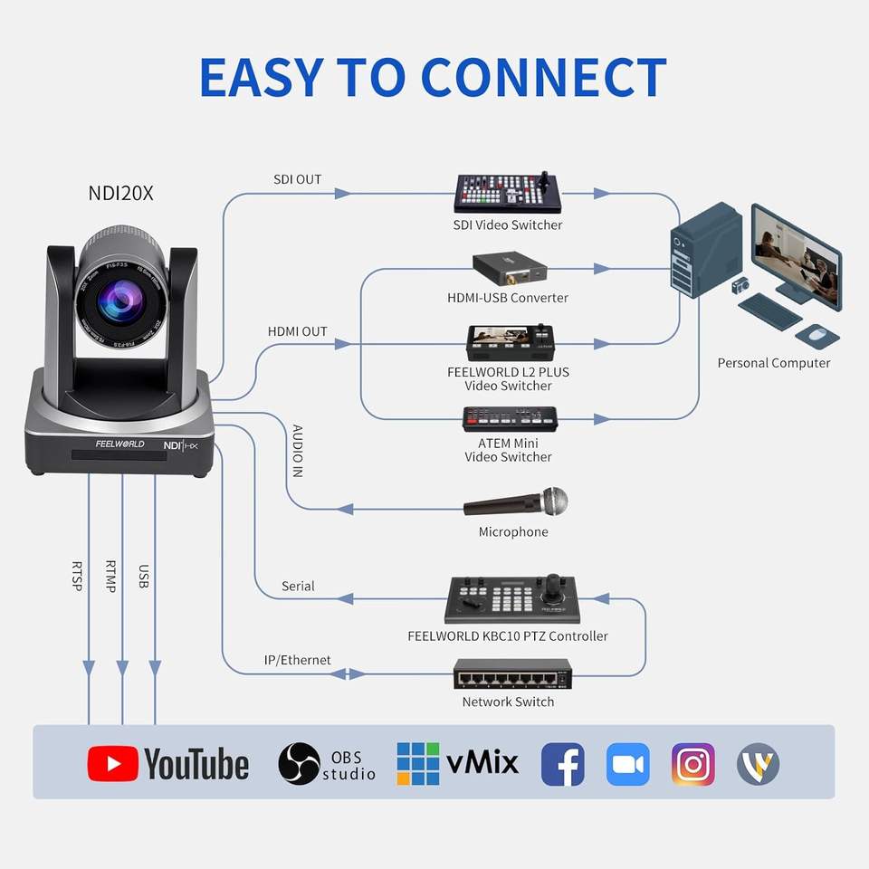Caméra PTZ FEELWORLD NDI20X avec suivi automatique, zoom 20x, 1080p 60fps, NDI HDMI 3G-SDI USB pour diffusion en direct d'église, service OEM