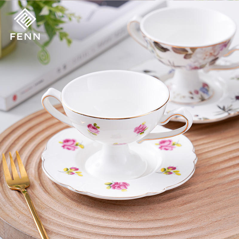 FENN Vente en gros de tasses à glace en céramique personnalisées, tasses à dessert en porcelaine et soucoupes, ensemble de tasses à glace, yaourt, pudding pour cadeau