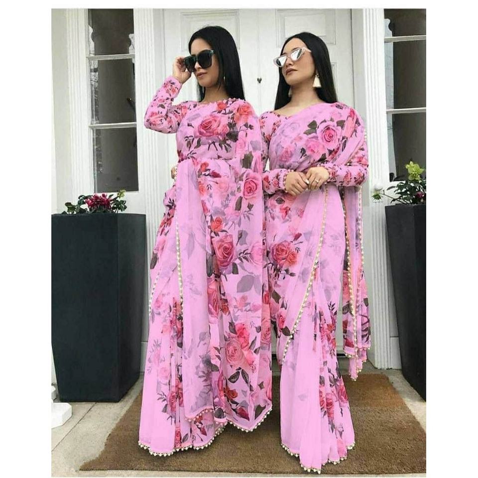 FESTIVAL WEAR IMPRESSION NUMÉRIQUE TRAVAIL SAREE AVEC CHEMISIER NON COUDU ROSE