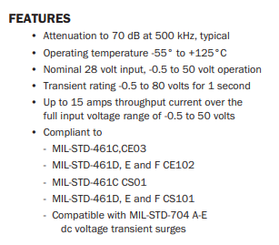 Filtres d'entrée EMI FMCE-1528 en aluminium, plastique et acier inoxydable, entrée 28V - 15A pour équipement électronique, température de fonctionnement