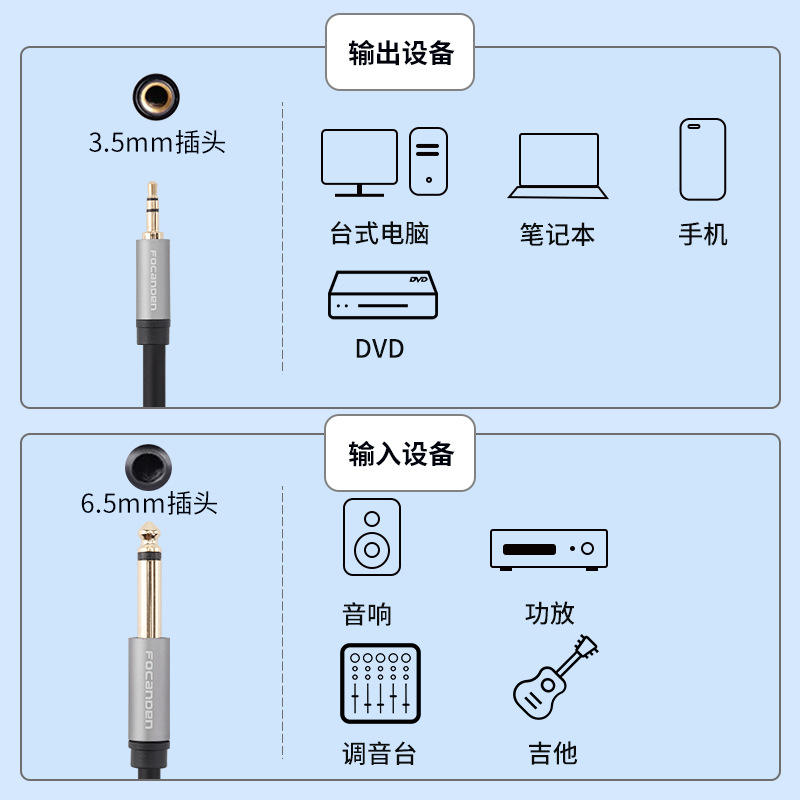 Câble audio FOCANDEN, adaptateur de prise 6,5 mm à 3,5 mm pour guitare, ordinateur, téléphone, haut-parleur, mixeur, amplificateur