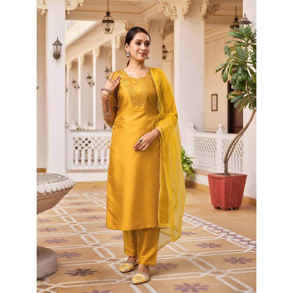 Vêtements de cérémonie en coton brodé haut bas avec dupatta jaune