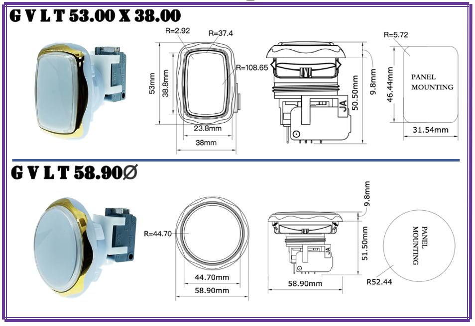 FRO-GVLT 53*53 bouton poussoir de machine, bouton poussoir d'arcade, bouton poussoir de jeu LED GVLT