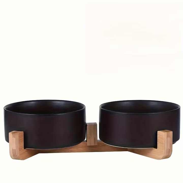 Bols à nourriture pour chat en céramique double surélevés FT05 avec support en bambou, design intérieur facile à nettoyer
