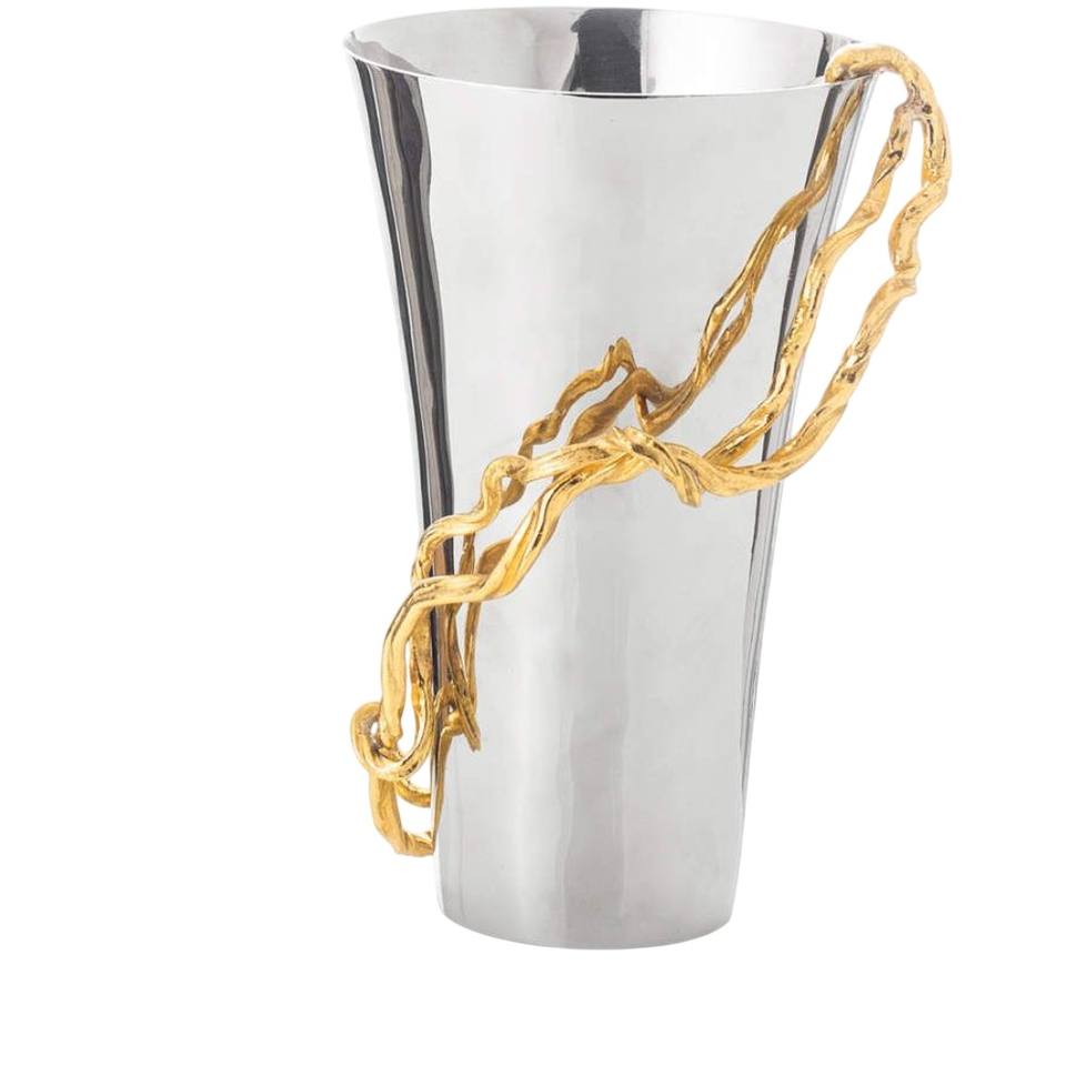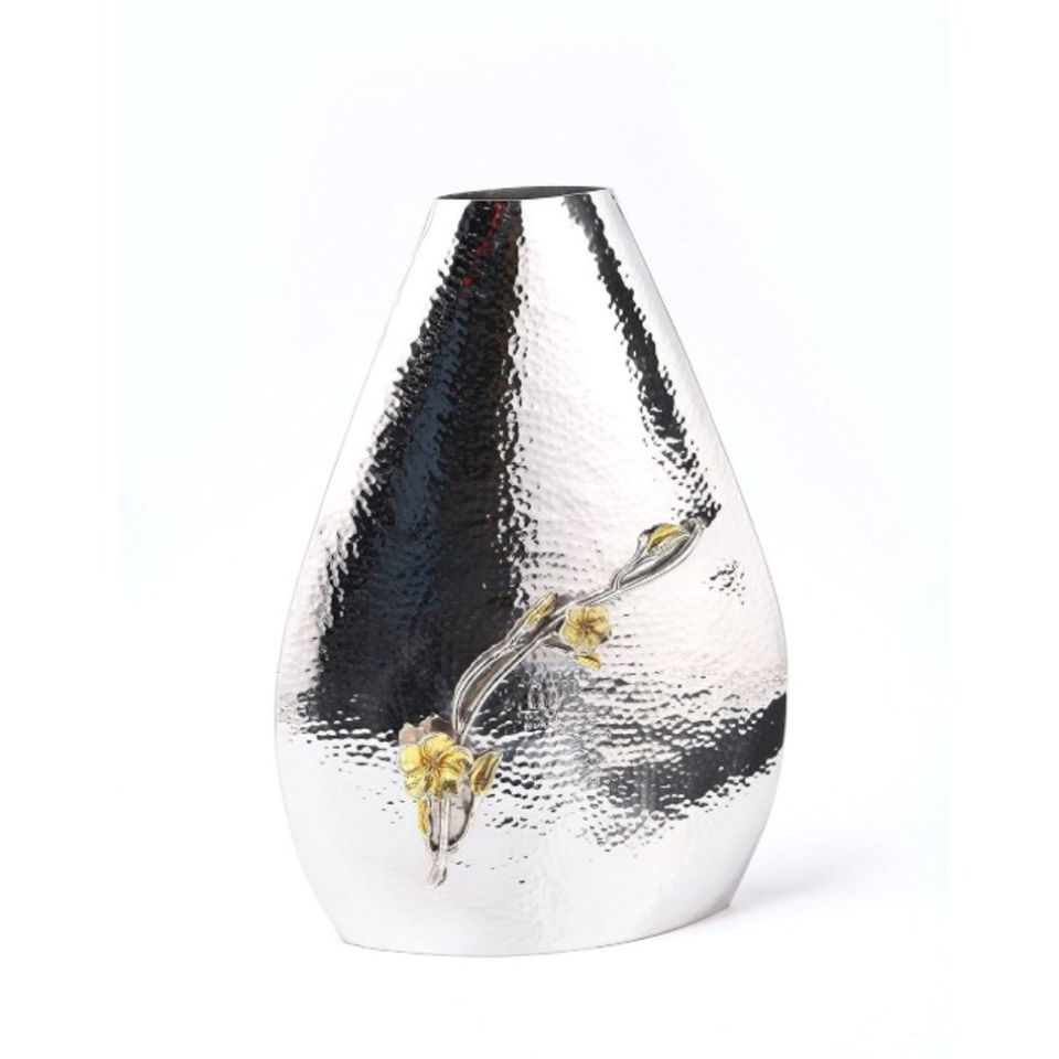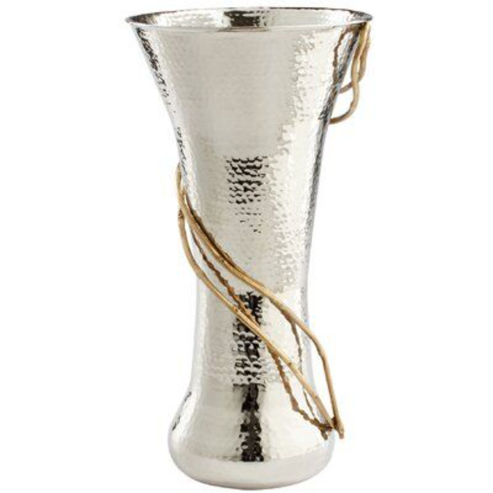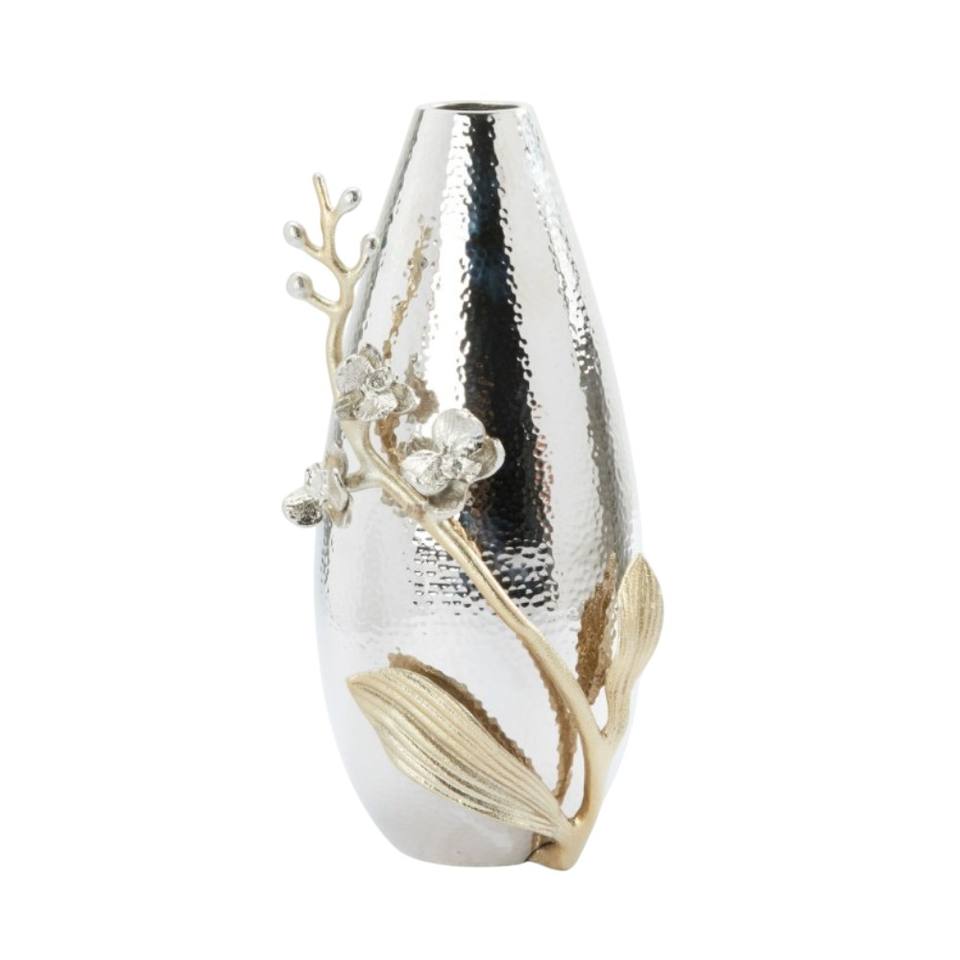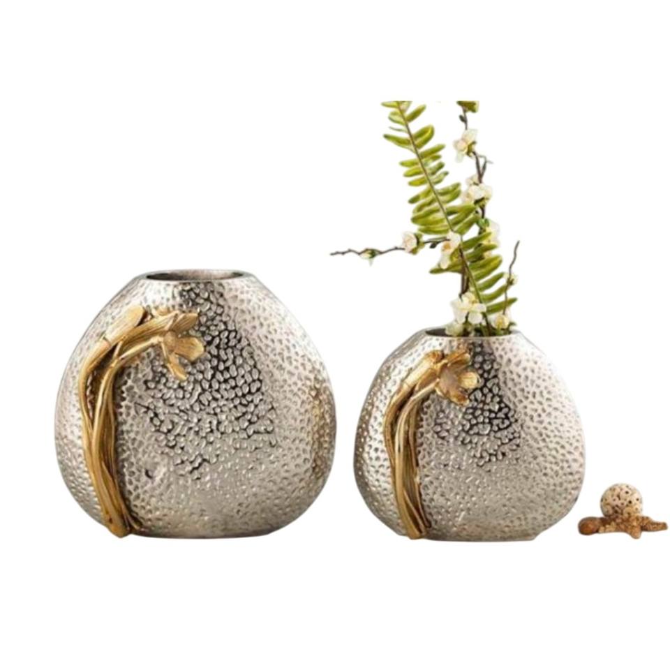 Vase en métal argenté au design fabuleux ensemble de 2 avec accent de vigne florale dorée pièce maîtresse de table texturée martelée pour la décoration intérieure