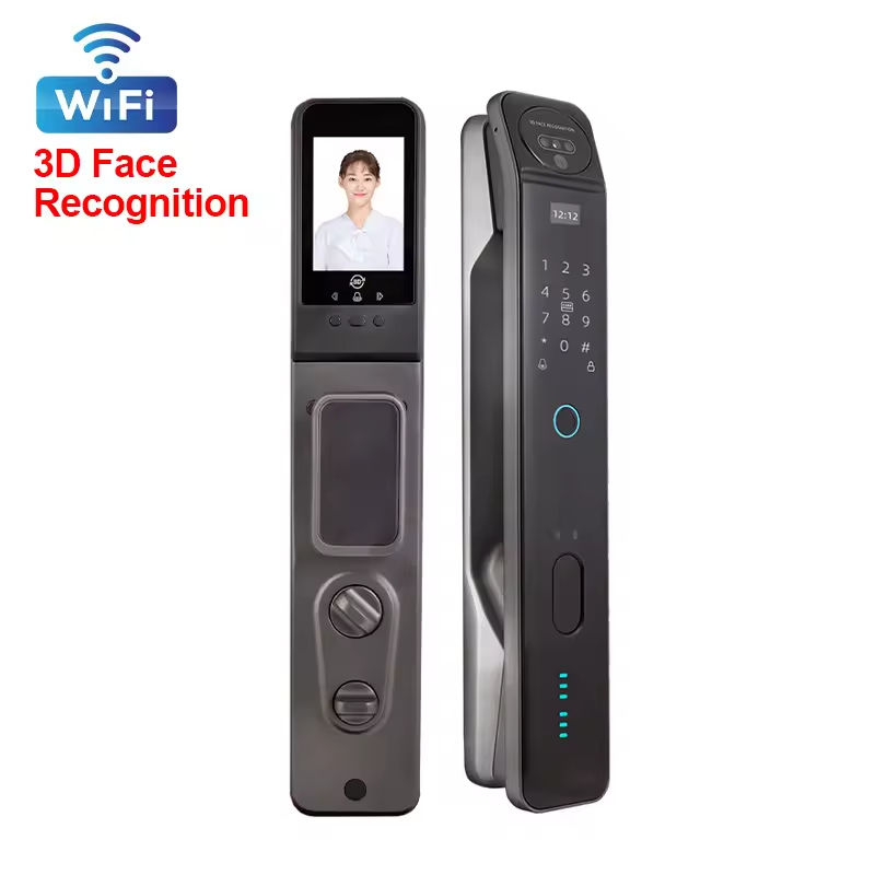 Serrure de porte intelligente WiFi avec reconnaissance faciale, empreinte digitale, mot de passe, carte, clé numérique, batterie 4200mAh (certifiée CE/FCC, 5-8 mois)