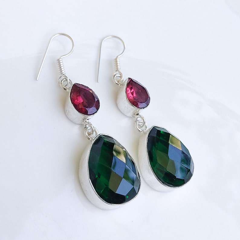 Boucles d'oreilles pendantes multi-pierres émeraude facettées, fil plaqué argent 92,5, boucles d'oreilles faites à la main, bijoux bohèmes en cristal, cadeau pour maman et cadeau