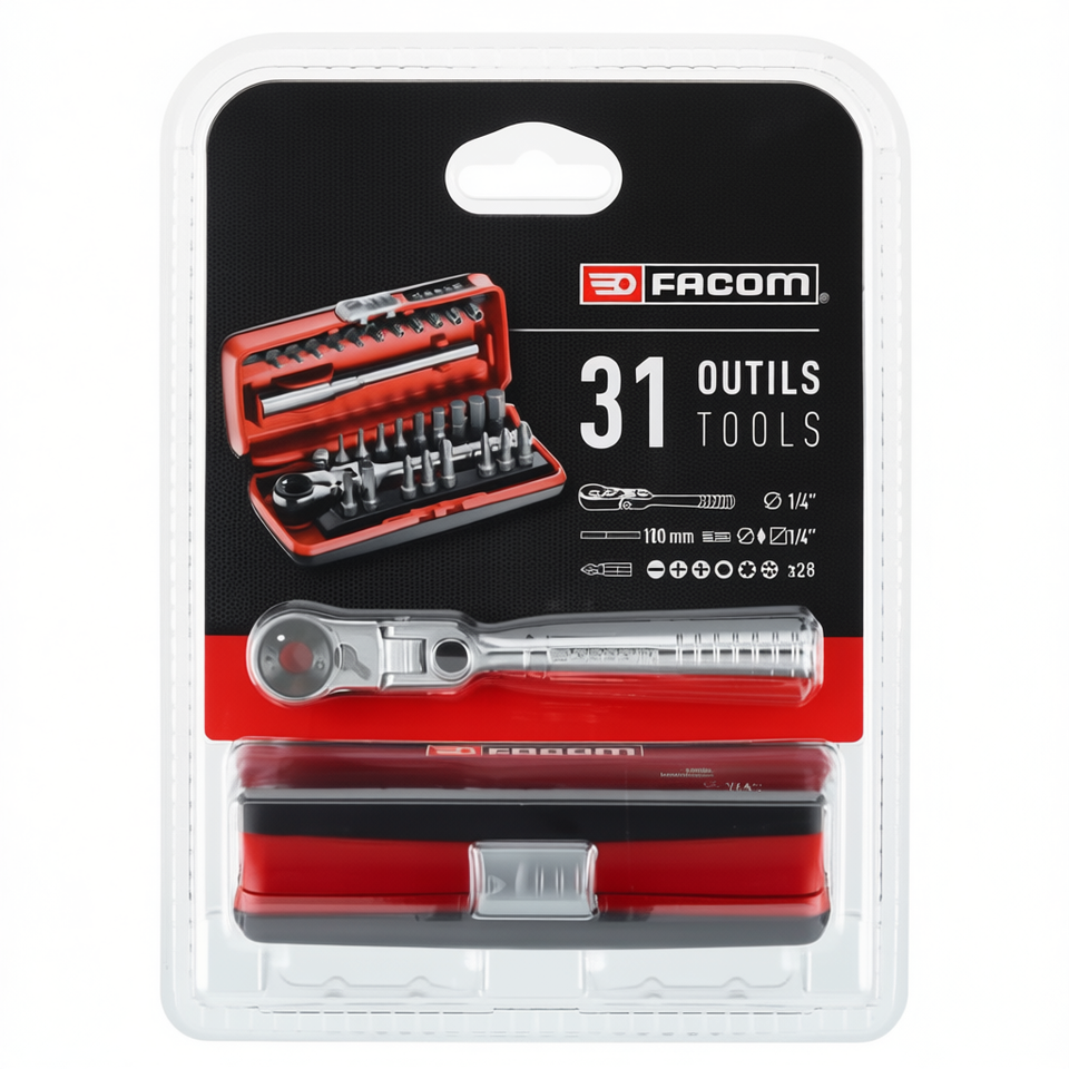 Jeu de douilles Facom 1/4'' avec cliquet flexible compact (31 pièces) pour utilisation avec des douilles
