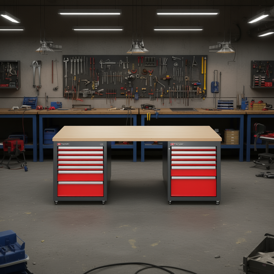 Banc de travail bas Facom de 2,2 m avec 13 tiroirs et plan de travail en bois, armoire à outils