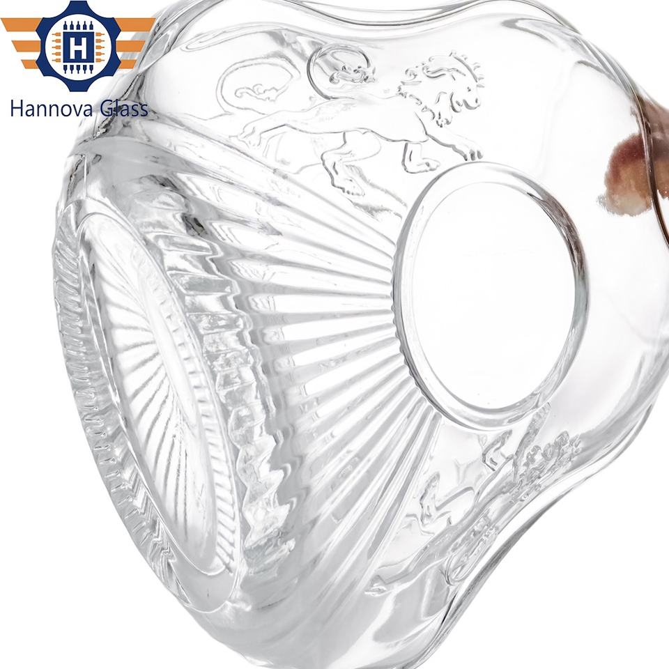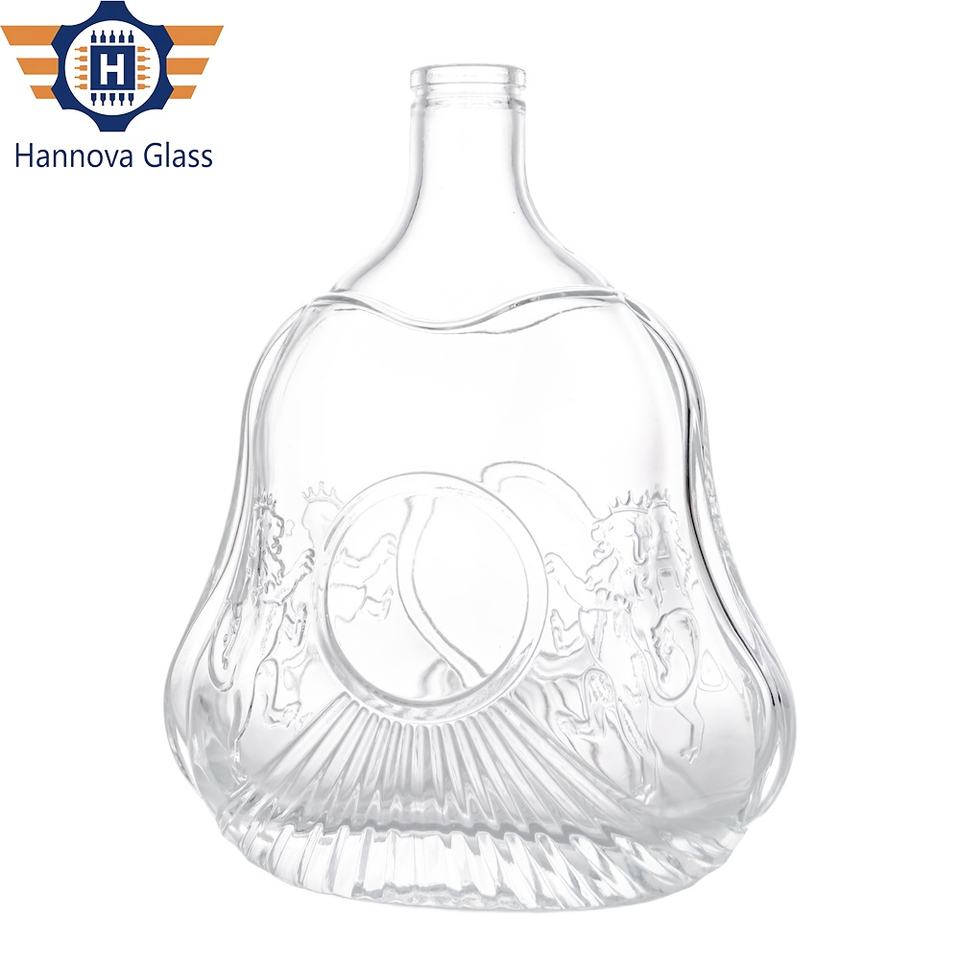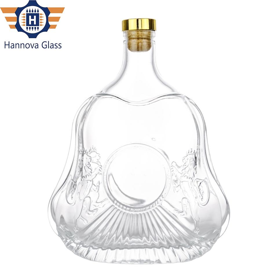 Bouteille en verre en forme de gourde plate de 1 litre d'usine pour brandy XO de qualité supérieure avec motif gravé et bouchon doré