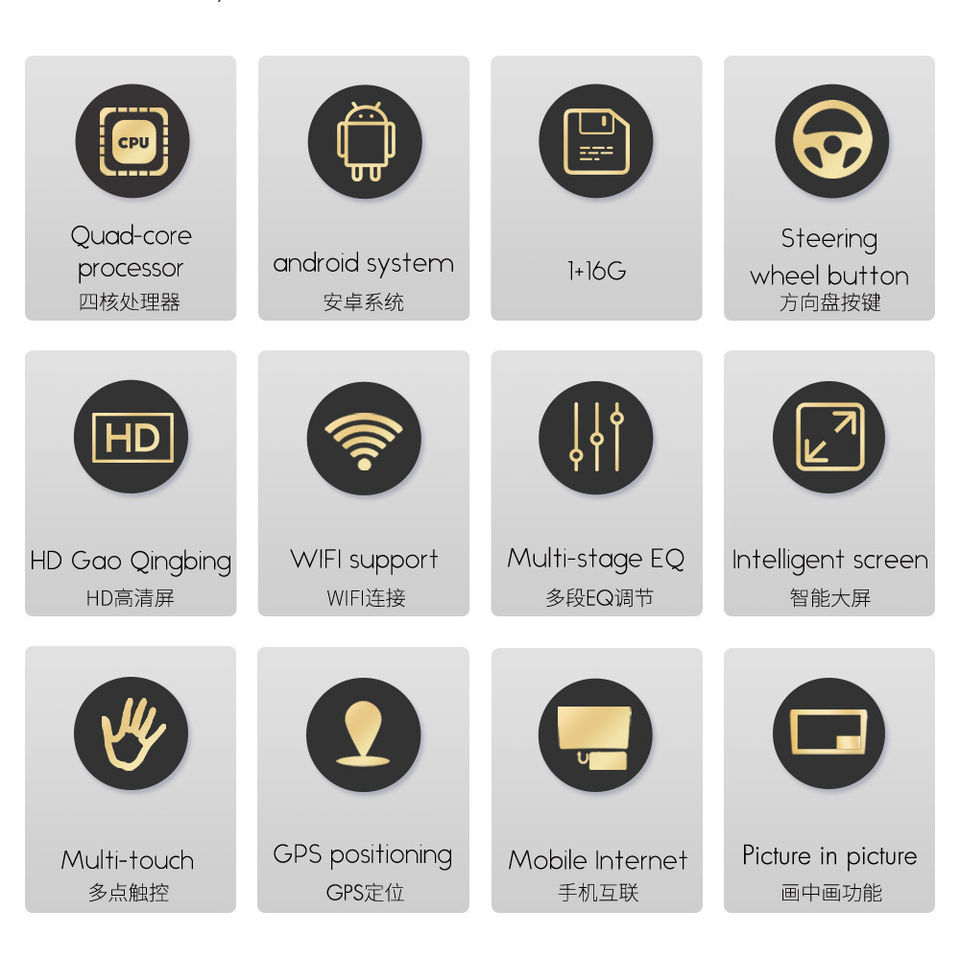 GPS, Stéréo, Amplificateur, CarPlay, Lien de miroir, Android auto, Image dans l'image, Microphone intégré, Écran partagé, Hi-Res Audio, Haut-parleur intégré, Support multilingue