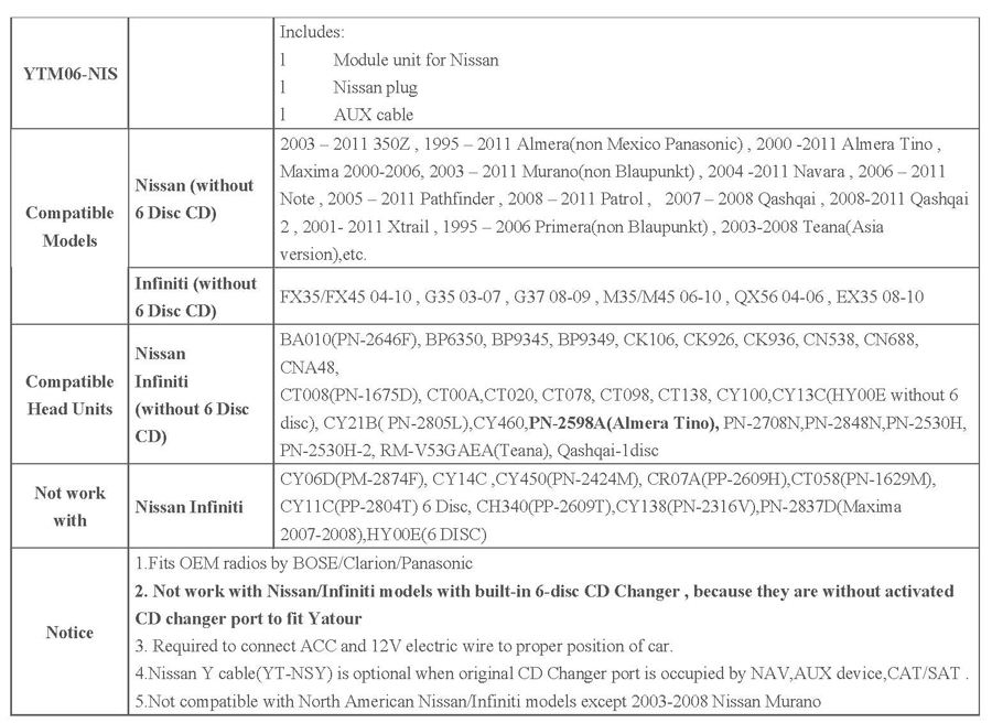 YT-BTK-NIS pour Nissan:350z/Almera/Murano/Navara/Note/Pathfinder
