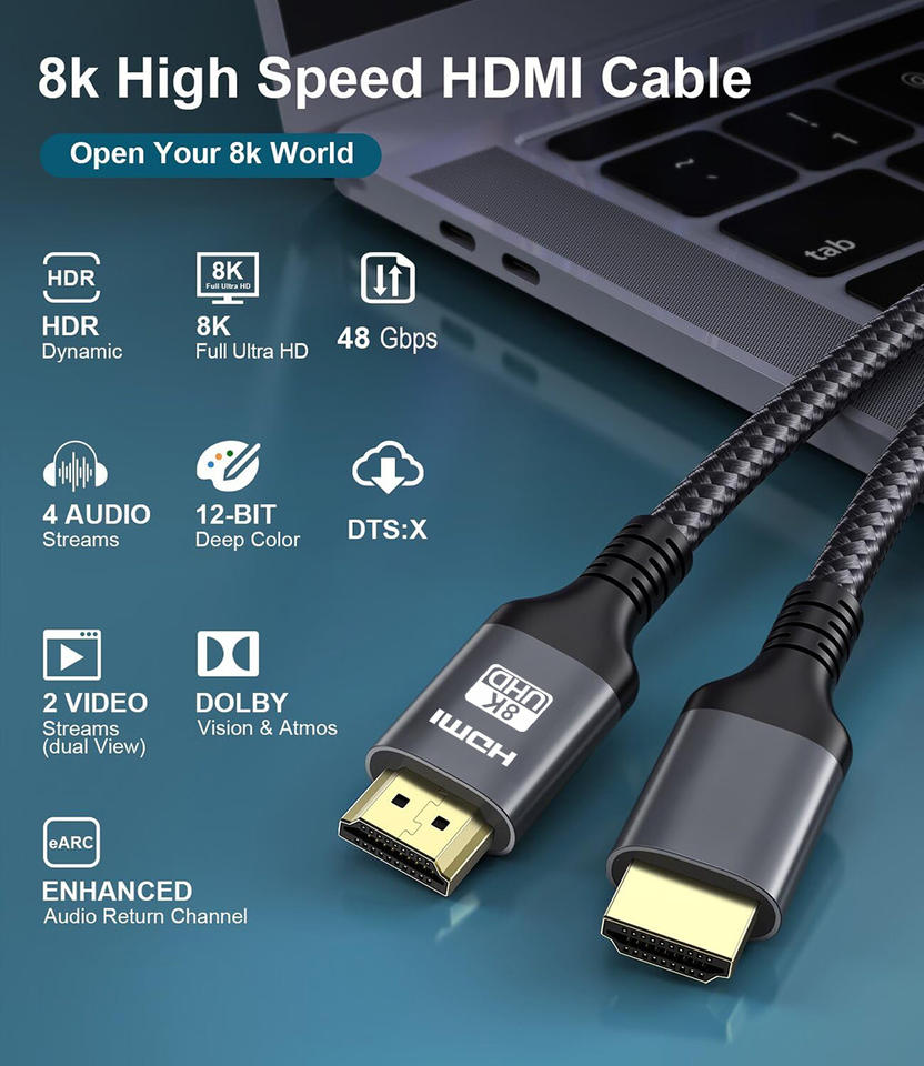 Câble hdmi 2.1 8k certifié en usine plaqué or 1m 2m 1.5m 3m 10m câble hdmi 8k 60hz 3d 48gbps câble hdmi 8k tresse en nylon