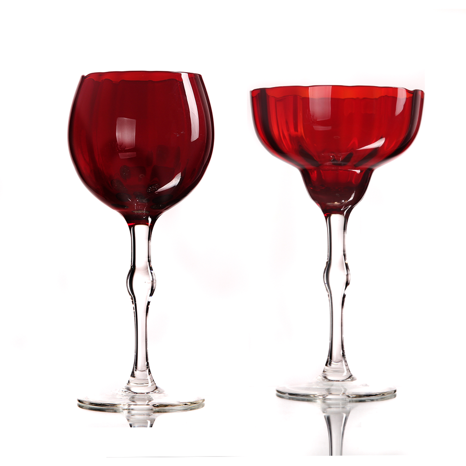 Verres à vin en cristal de verre à vin rouge à longue tige de couleur rouge côtelée faits à la main bon marché d'usine