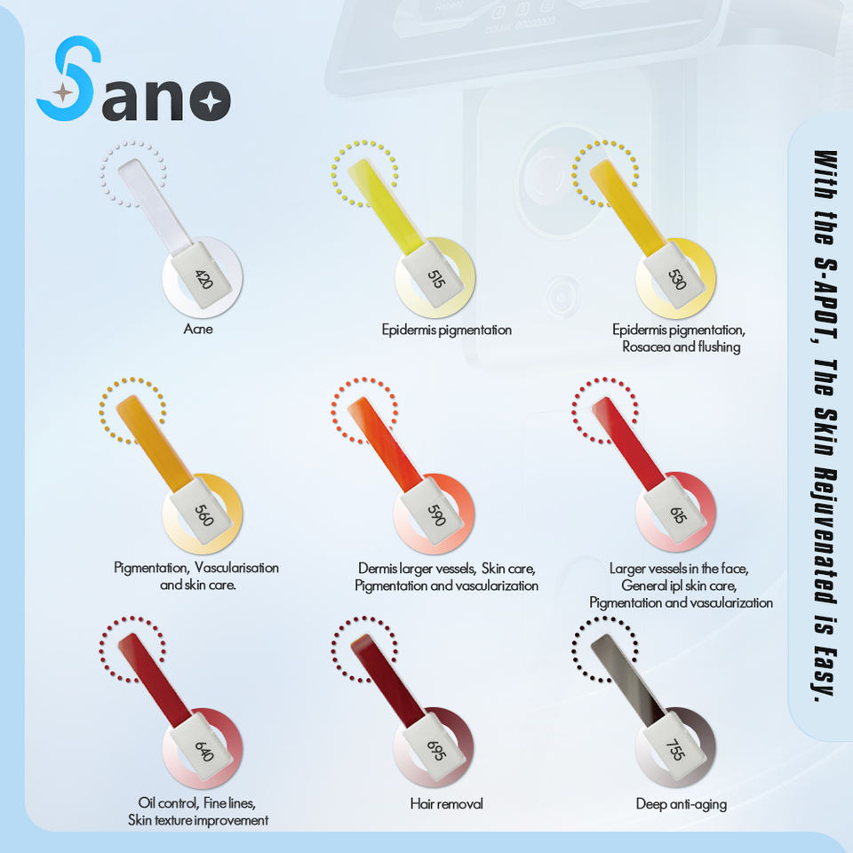 Traitement de l'acné, Epilation , décoloration, Rajeunissement de peau, Anti-bouffi, Raffermissement de la peau , Enlèvement de vaisseaux sanguins, Solvant de ride, Cercles foncés, Pore Remover , Correcteurs de pigmentation, Vascular removalCaractéristiques