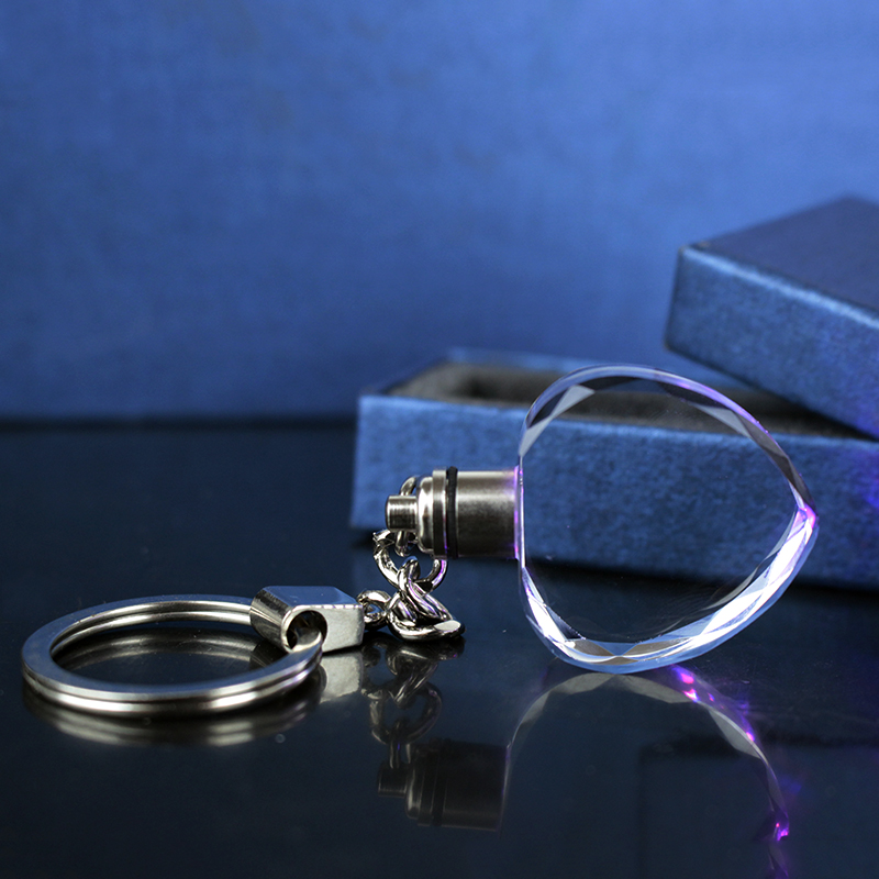Usine pas cher en gros cristal verre coeur porte-clés personnalisé 3D LOGO gravé au laser avec porte-clés lumière LED colorée