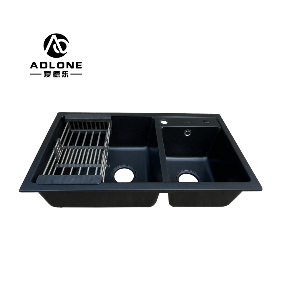 Évier de cuisine à double bol en granit noir composite d'usine pour une utilisation de cuisine à domicile avec poste de travail en quartz