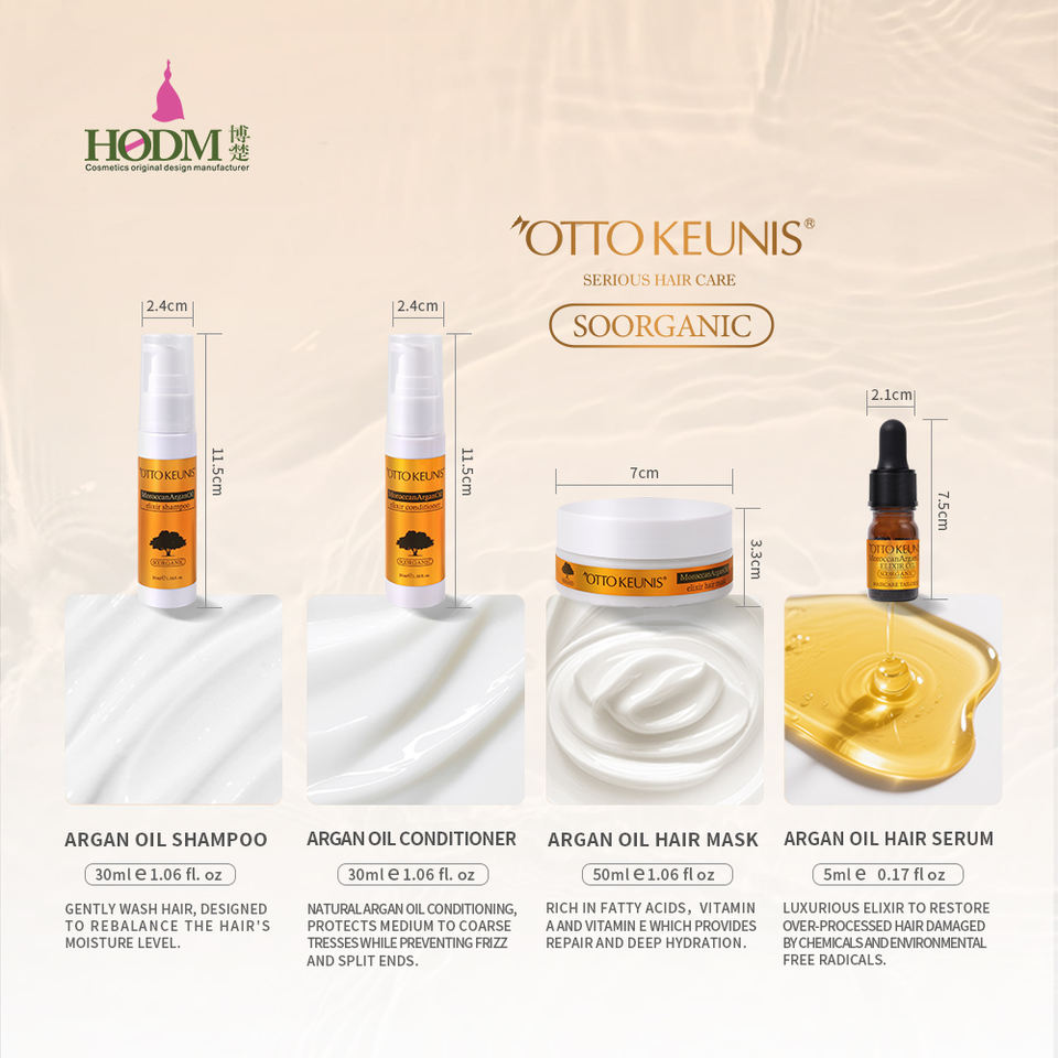 Ensemble de soins capillaires à l'argan personnalisé en usine, shampoing et revitalisant, masque capillaire et huile capillaire, qualité salon, taille hôtel, réparation hydratante