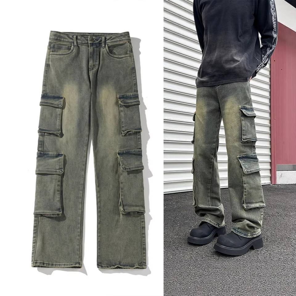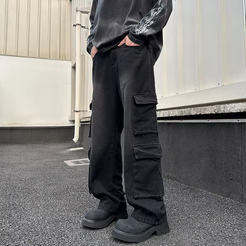 Pantalon en jean ample délavé brodé avec logo personnalisé pour homme – Coupe décontractée mi-haute, jambe large